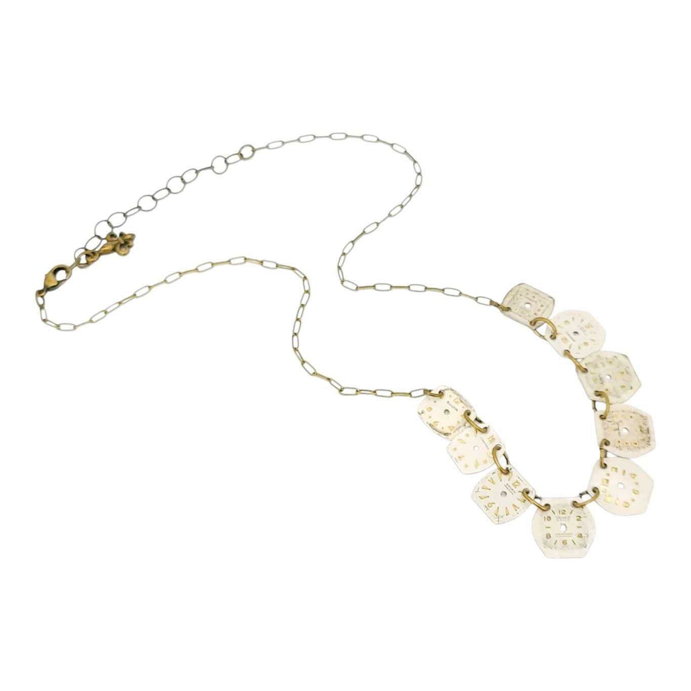 A single strand of vintage watch face dials on an antiqued brass-plated paperclip chain that adjusts from 16in to 18in with the included chain extender.