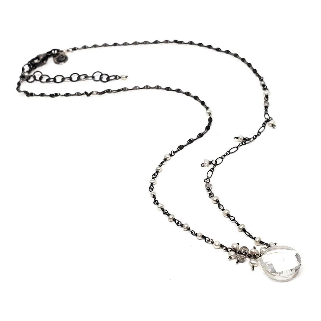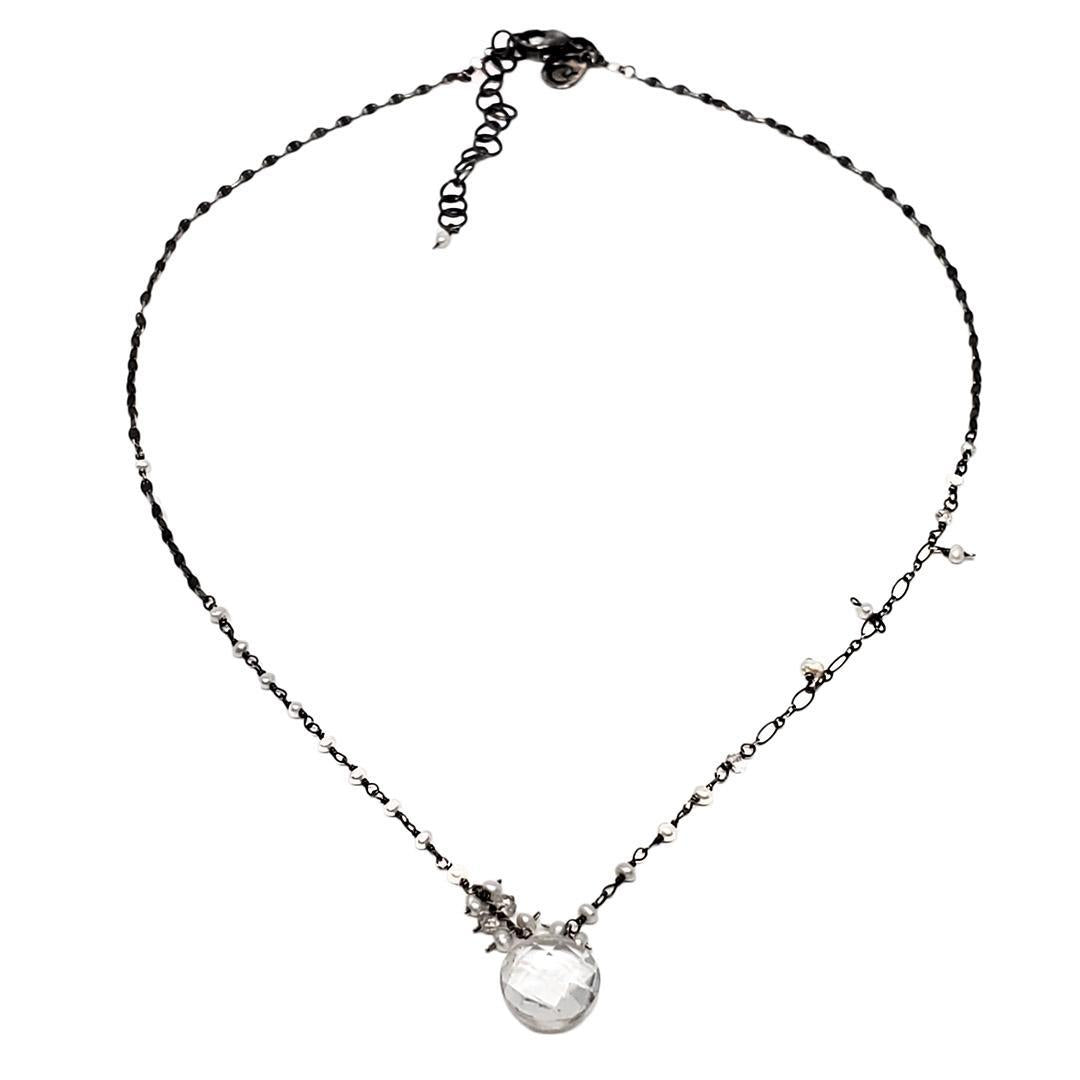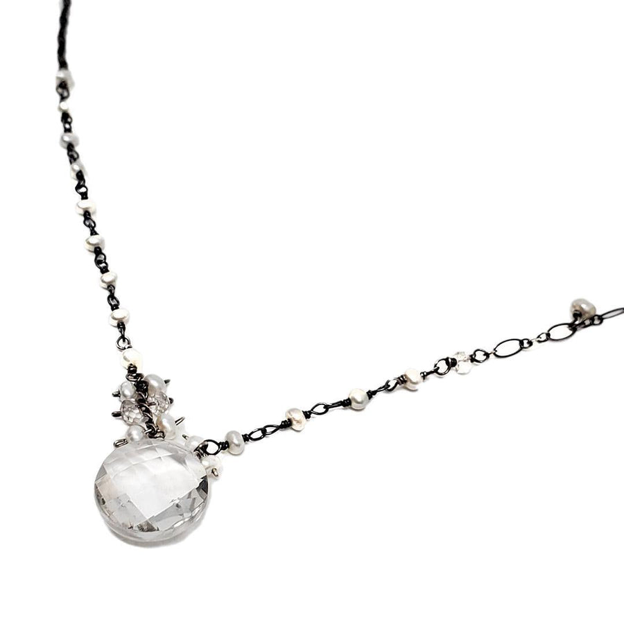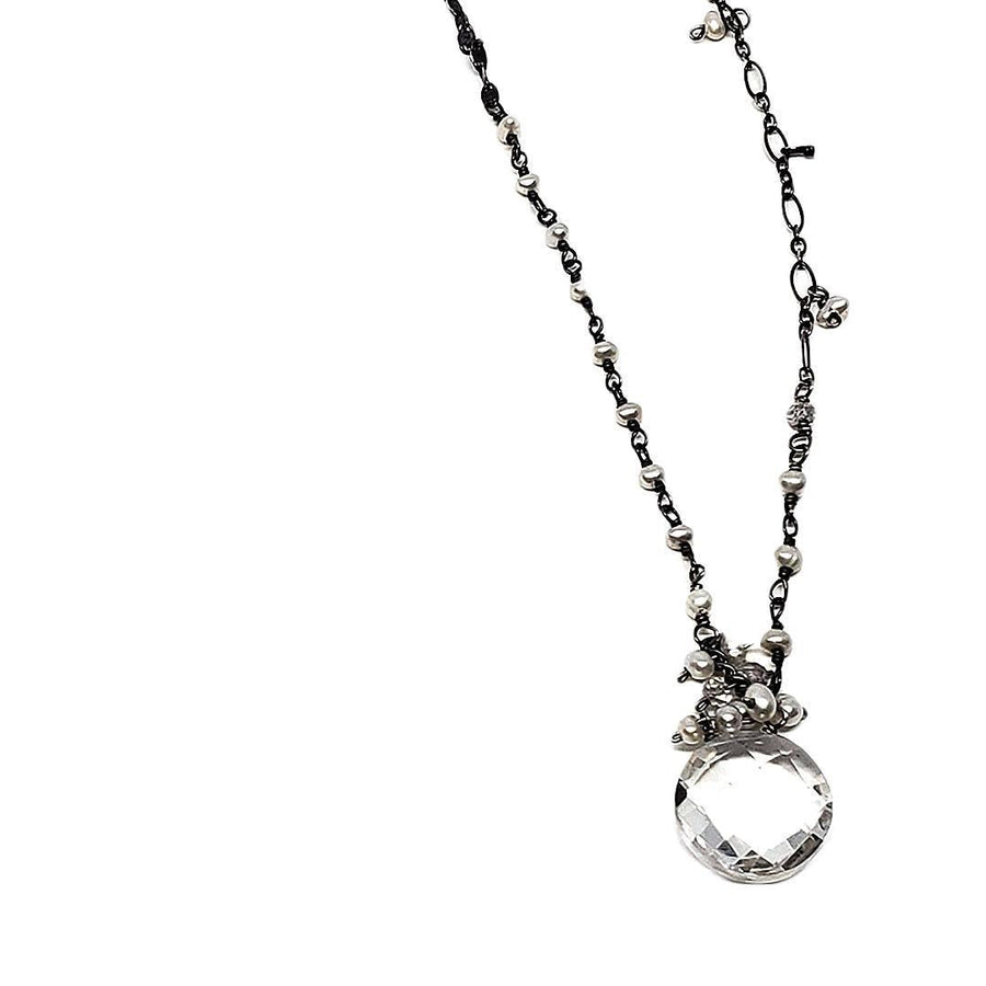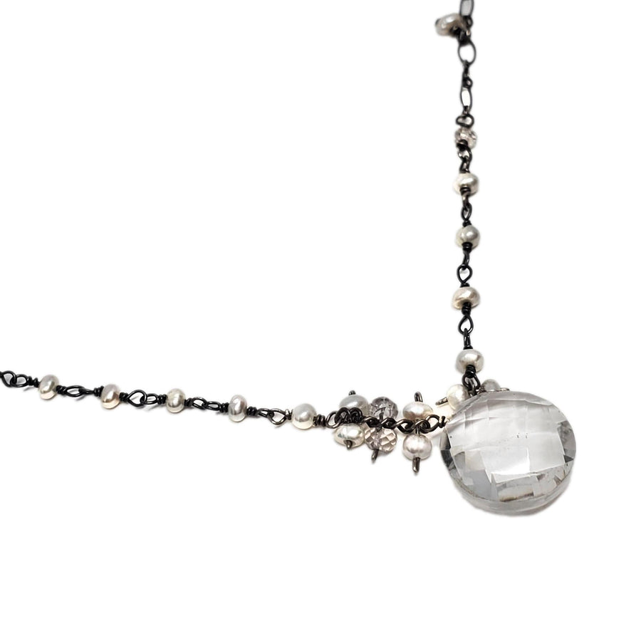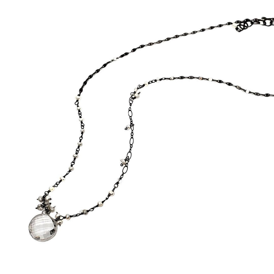 - An eye-catching faceted quartz coin hangs on an oxidized sterling silver chain with freshwater pearl and 14k gold fill accents