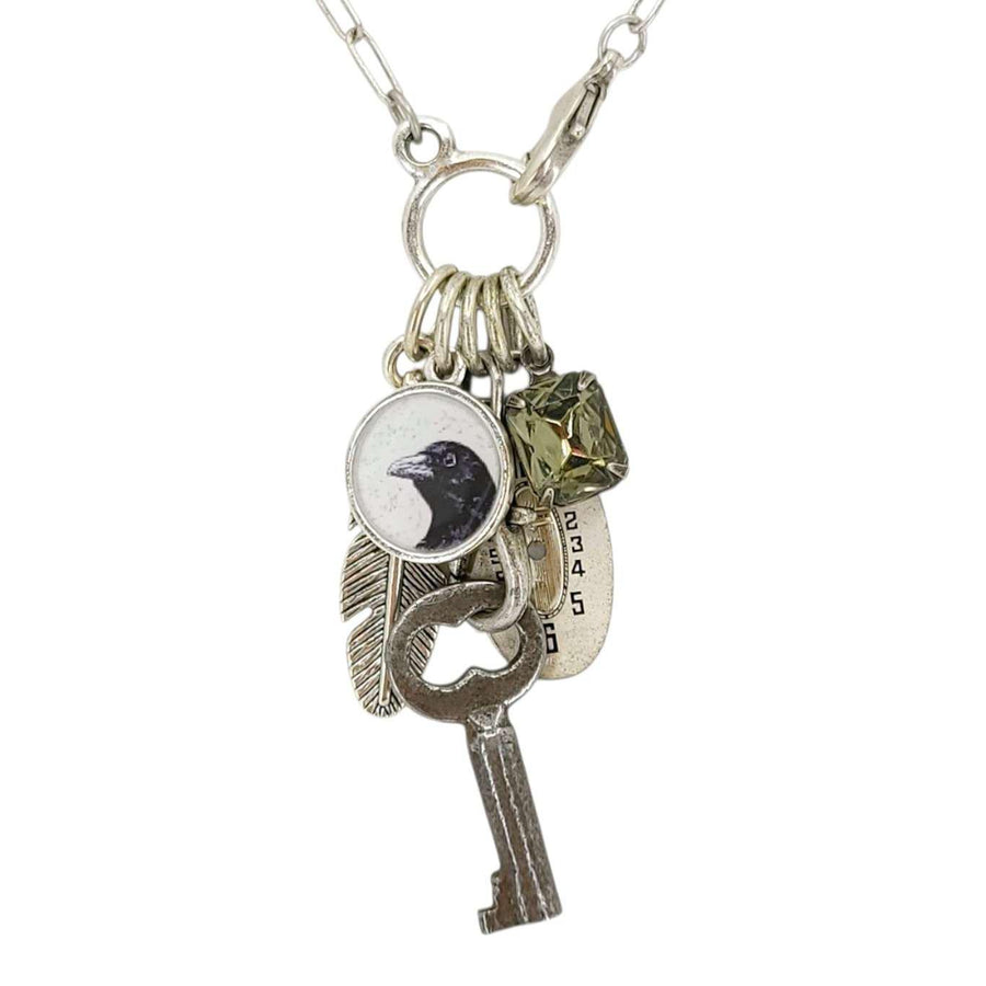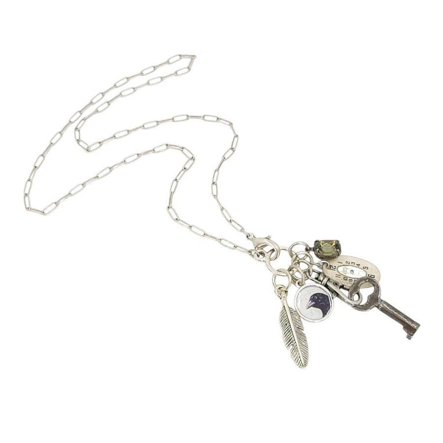 This lovely necklace features a small collection of items - a crow illustration by artist Alison Lang, a repurposed feather charm, a vintage key, a vintage watch dial, and a vintage rhinestone - all hung together on a plated brass alloy chain.
