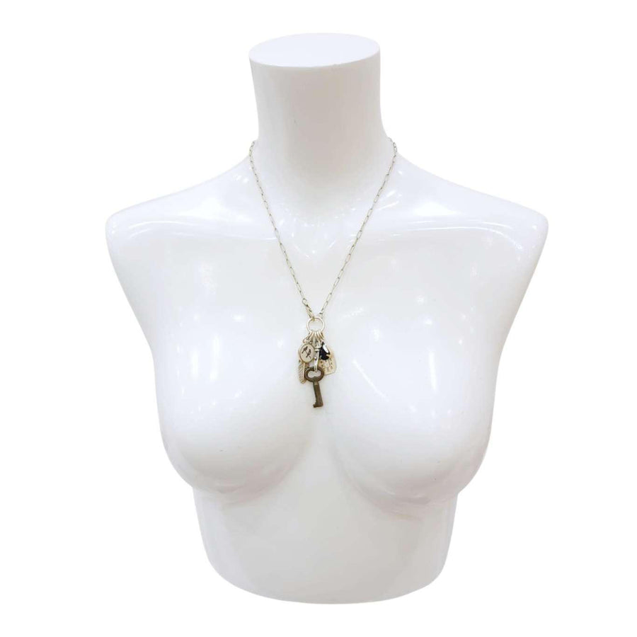 This lovely necklace features a small collection of items - a vintage image of songbirds, a repurposed feather charm, a vintage key, a vintage watch dial, and a vintage rhinestone - all hung together on a plated brass alloy chain.