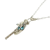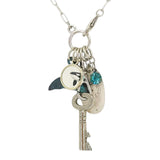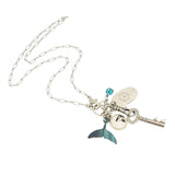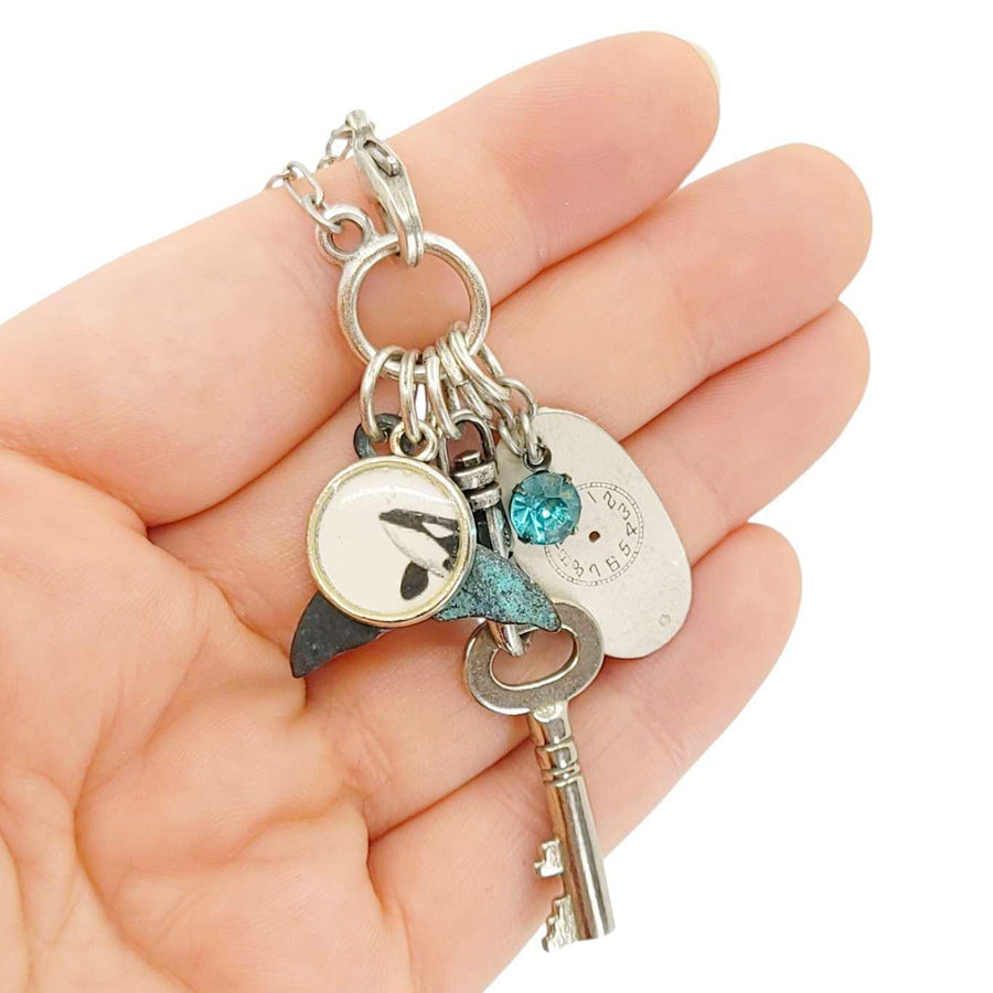 This lovely necklace features a small collection of items - an orca image by artist Alison Lang, a repurposed whale tail charm, a vintage key, a vintage watch dial, and a vintage rhinestone - all hung together on a plated brass alloy chain.