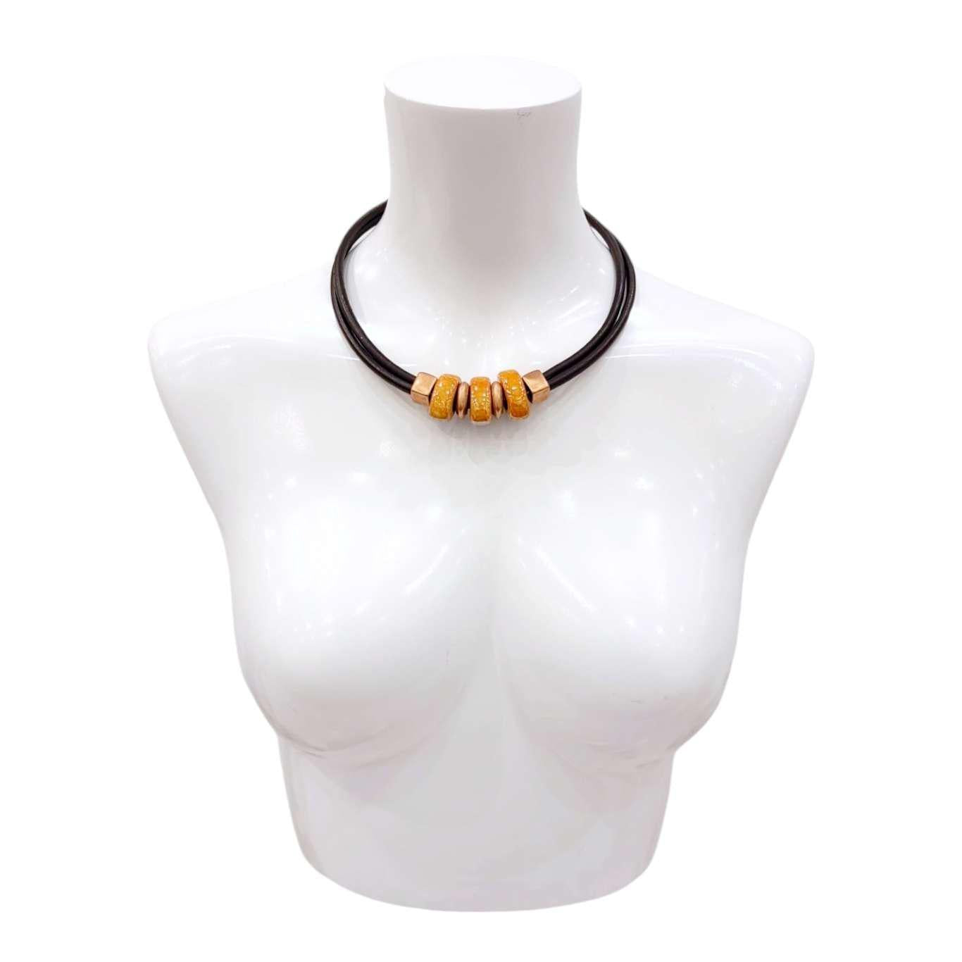 Reversible! Celestial Blue on one side of the focal beads, Solstice Orange on the opposite. Both sides pictured. Kona brown leather. 18" | Leather/ Ceramics | Lead & Nickel Free | Magnetic Closure No two necklaces are identical. Each necklace is unique because the focal beads are kiln-fired glazed ceramics. Slight variations in color and texture are to be expected and are highly prized by ceramic lovers.
