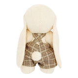 A pair of sweet cream-colored plush bunnies with movable arms and legs, one dressed in cotton overalls and the other in a cotton dress.