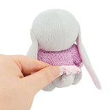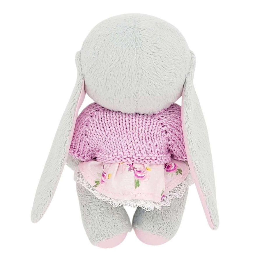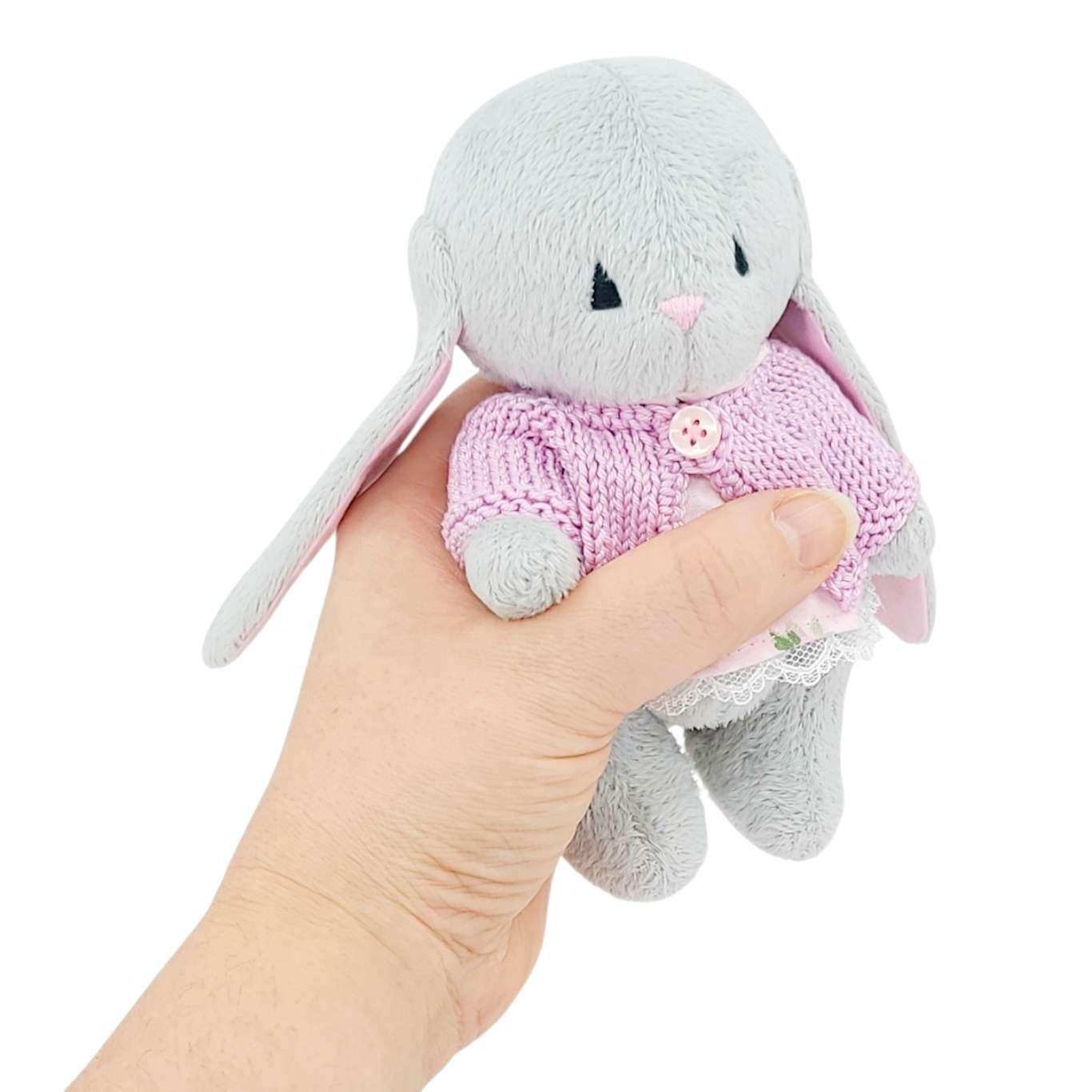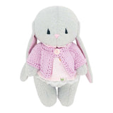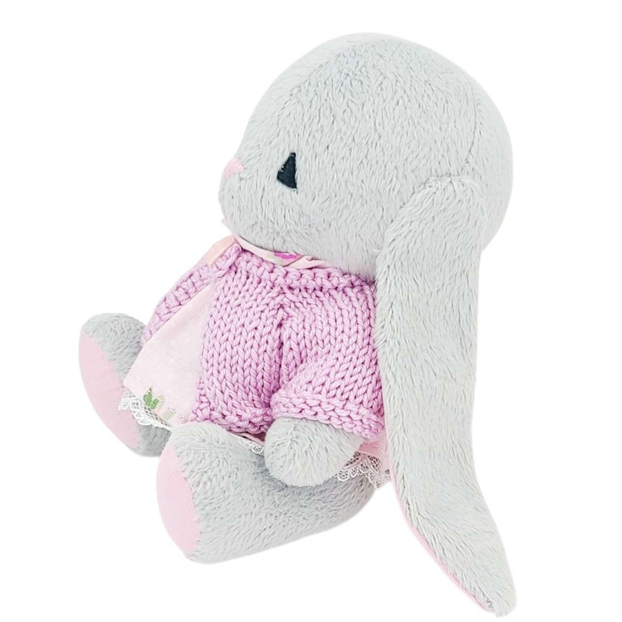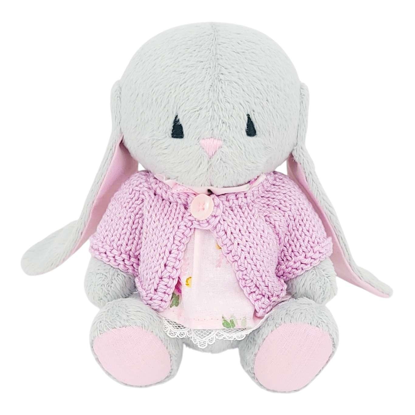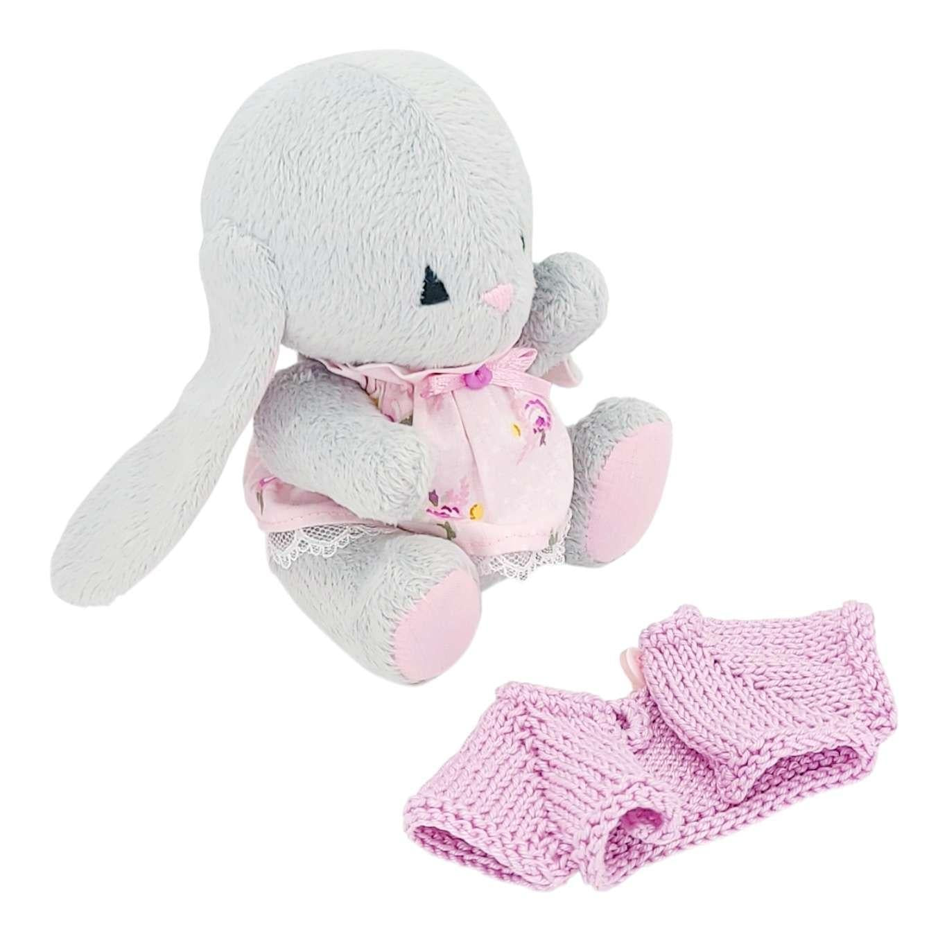 A sweet gray plush bunny with movable arms and legs is dressed in a lace-trimmed cotton dress and a pink sweater knitted just for them.