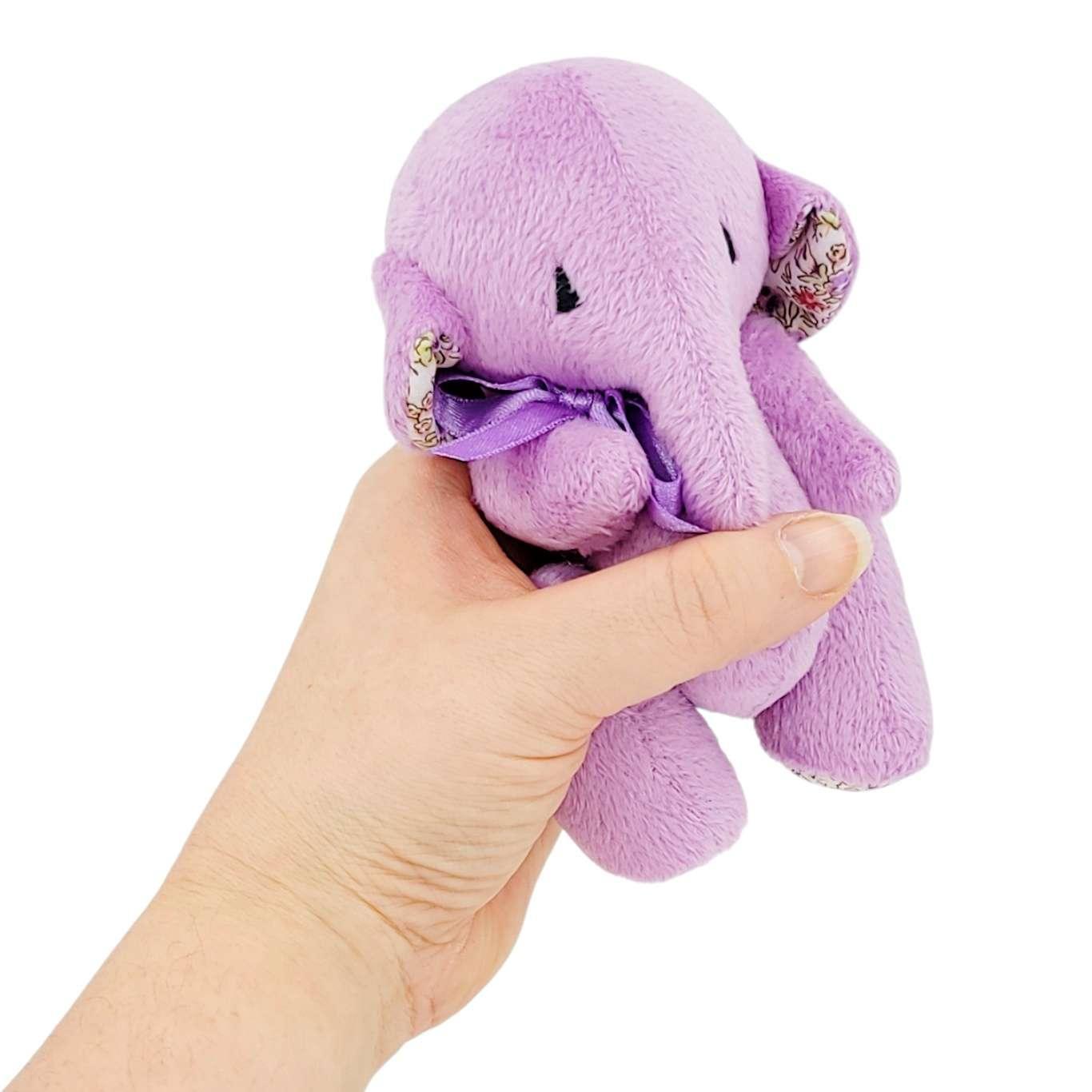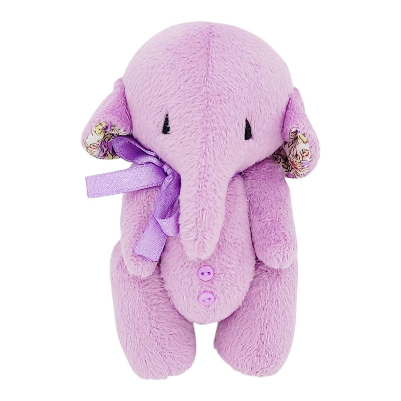 This sweet little hand-made lilac pink elephant features an embroidered face, a long trunk, soft ears, accents of garden floral cotton, and a pretty satin bow.