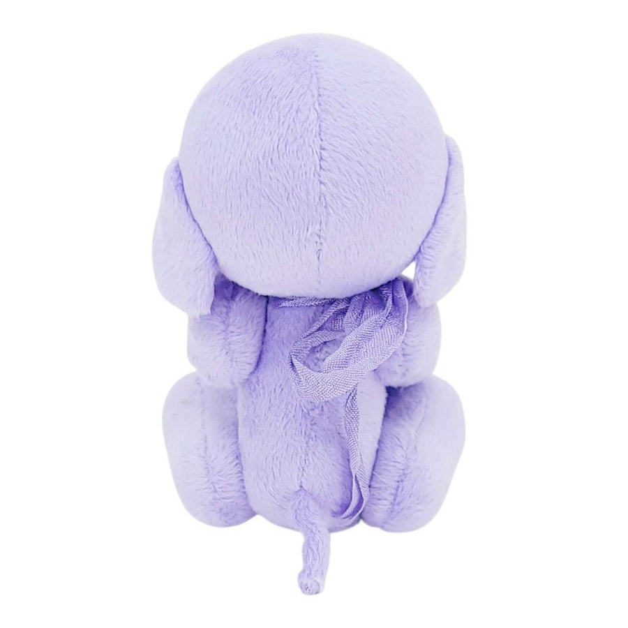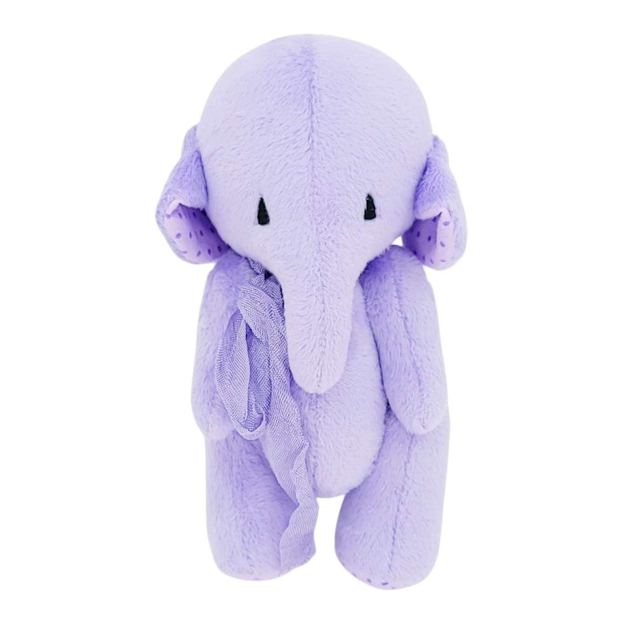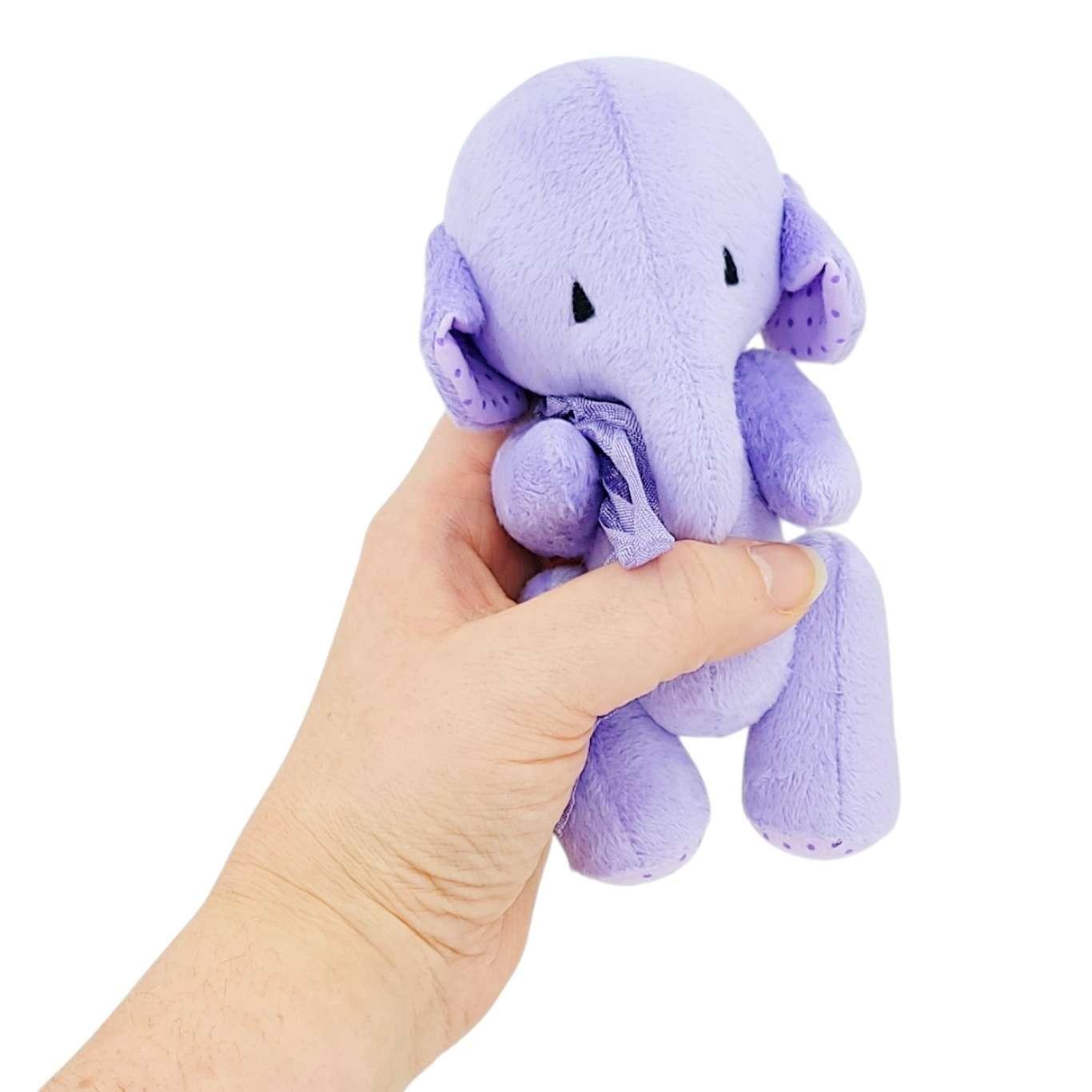 This sweet hand-made elephant features an embroidered face, a long trunk and soft ears, polka dot accents, and a pretty purple scarf tied around their neck.