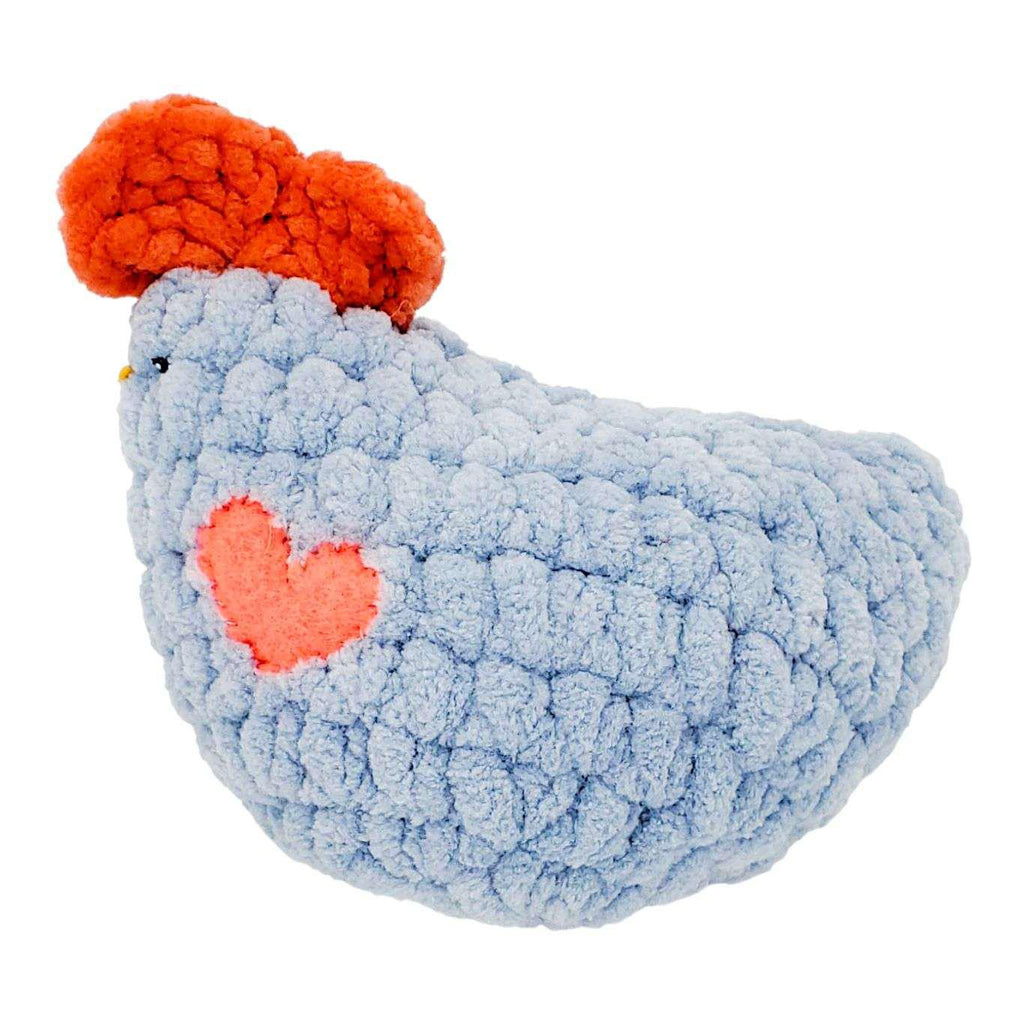 This chunky crocheted chicken is the cutest plush friend with its soft blue body, contrasting orange comb, and orange heart.