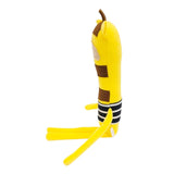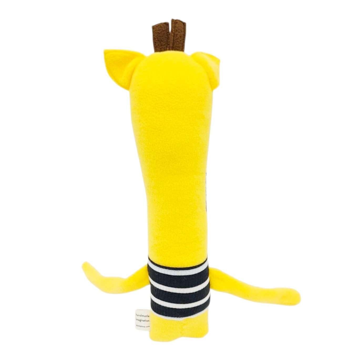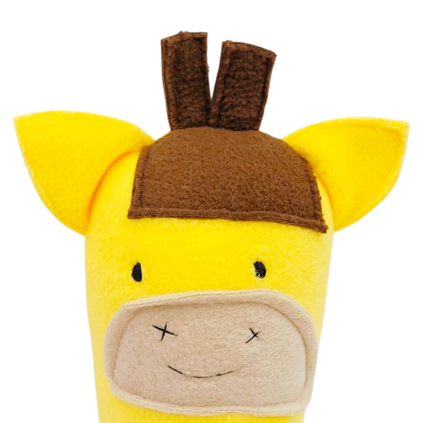 Toby the Giraffe is a cutie with soft ears and horns, long soft arms and legs, and a squishy stuffed body with an embroidered face! He’s even wearing a cute little shirt made of upcycled fabric (every plush has a different shirt).
