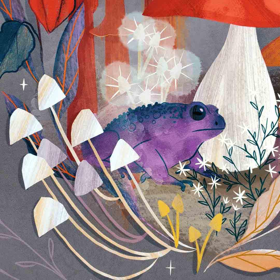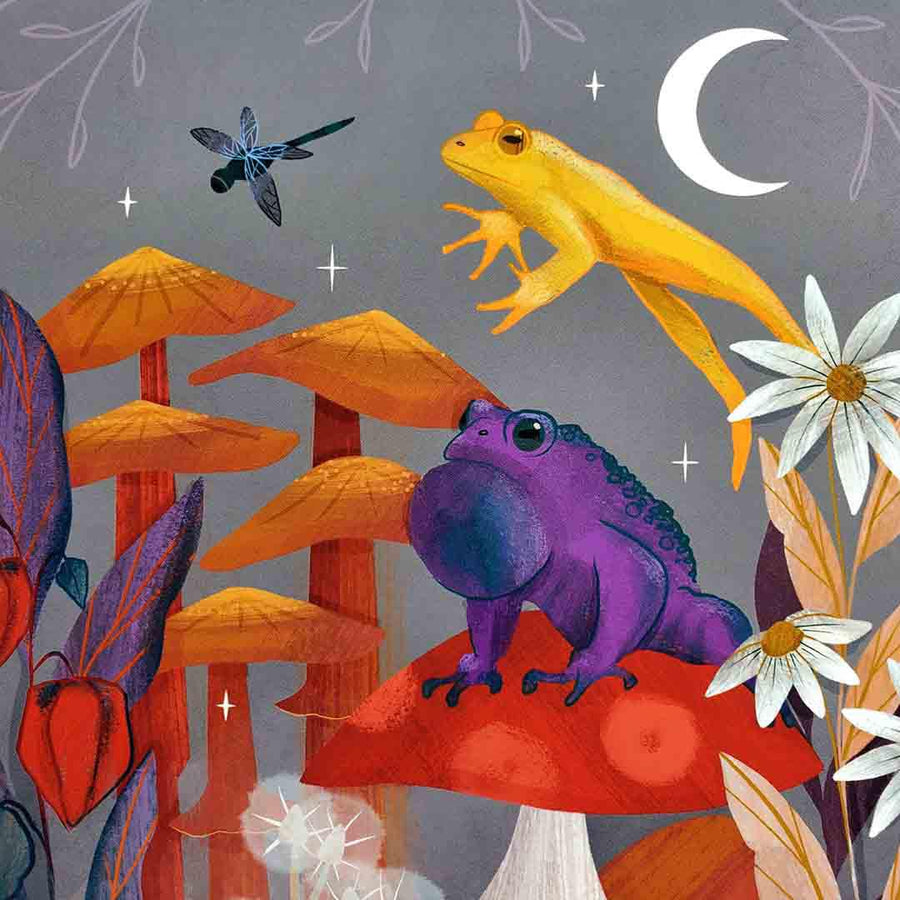 A trio of purple and yellow tinted toads sit amongst their toadstools and flowers under a white crescent moon.