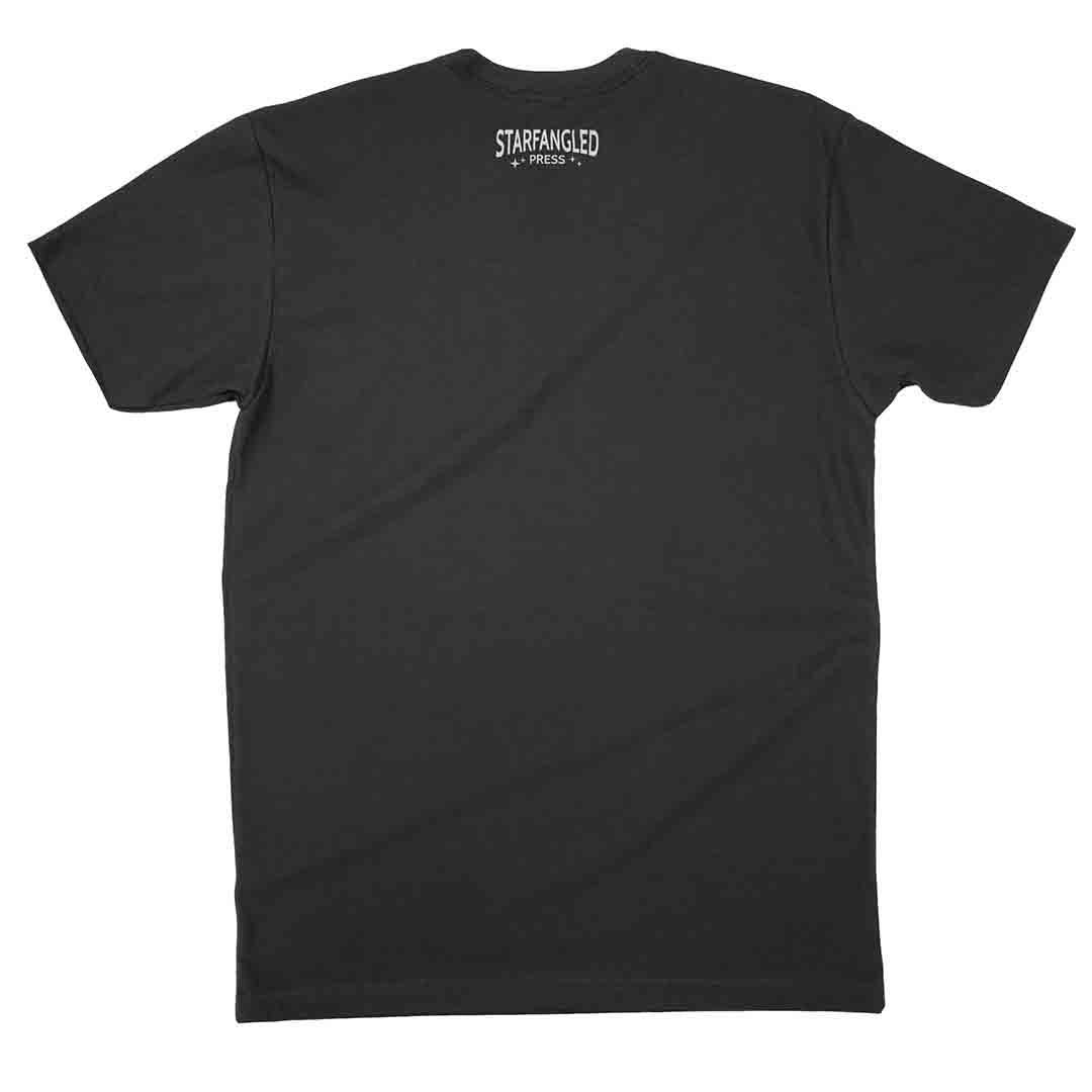 The image is screen printed by hand with subtly pearlescent white ink on a super soft, heathered charcoal, classic fit crew-neck t-shirt.