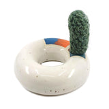 - Ceramic pot is donut-shaped with cream-colored glaze and orange-blue accent