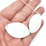 Approximately 2.75in x 1.25in x .08in with a 16in sterling silver chain.