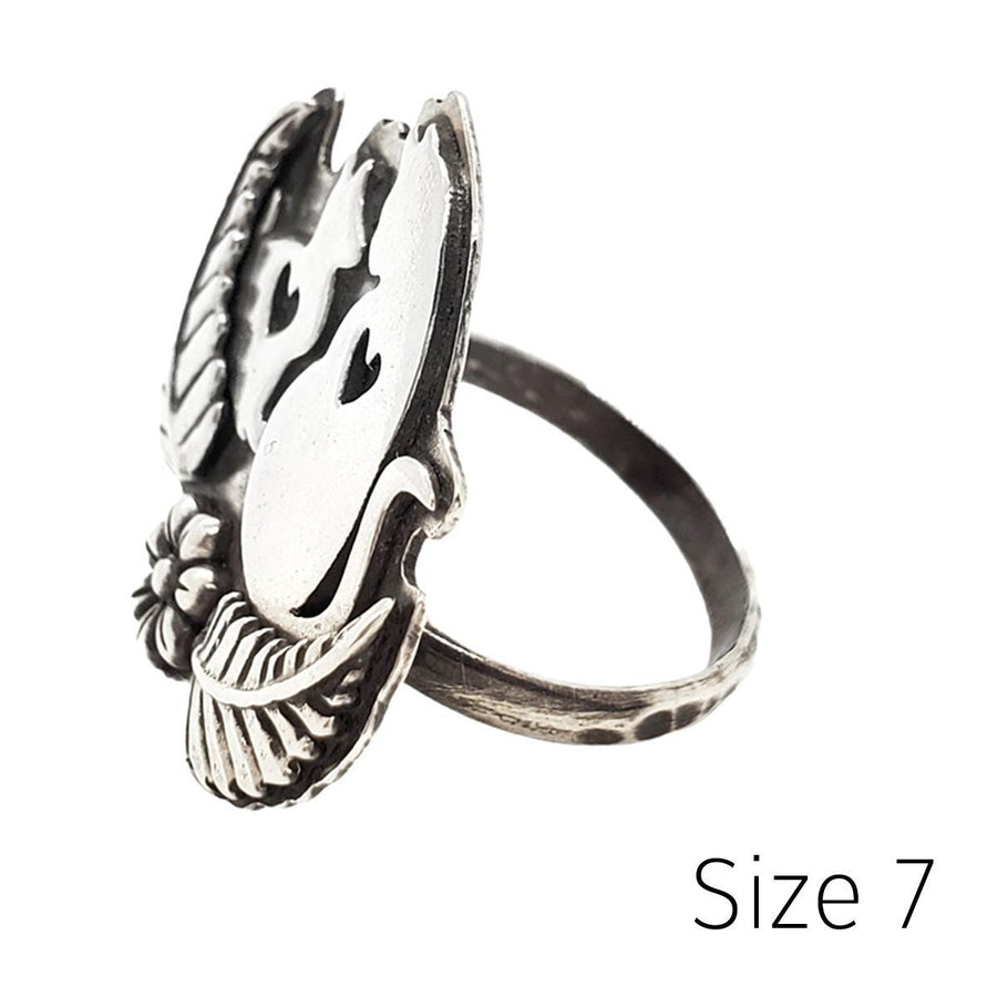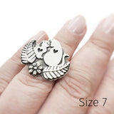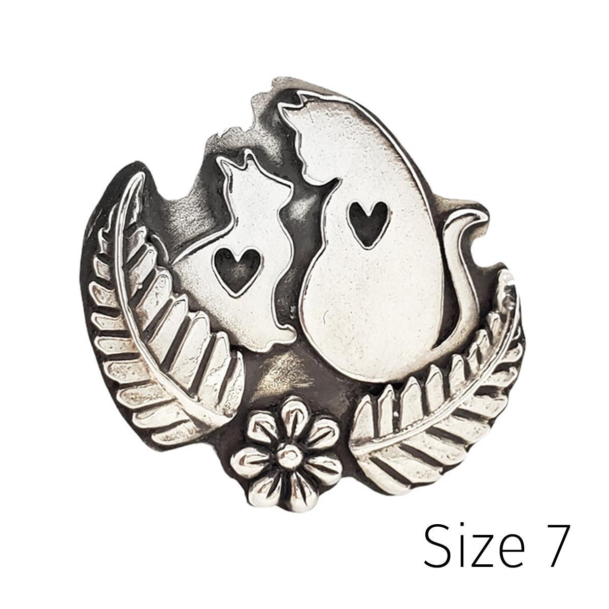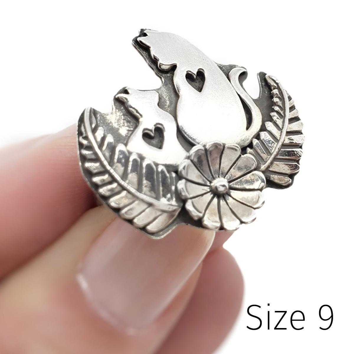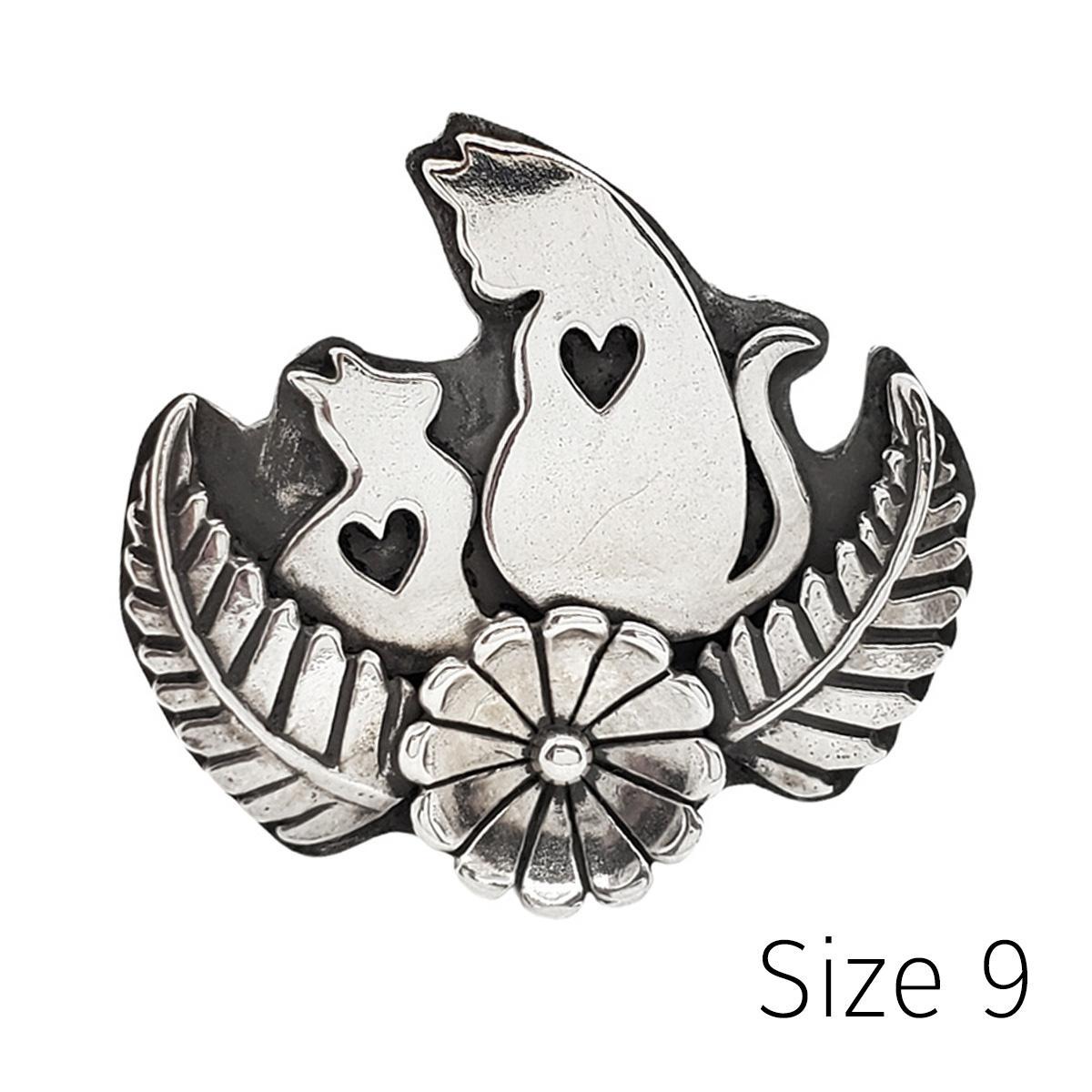 Two cats--big and small--look at each other in this sweet sterling silver statement ring. Each cat's silhouette features a heart-shaped cutout at the center. Our feline friends are sitting nestled in a flower-and-fern design with a hammered band.