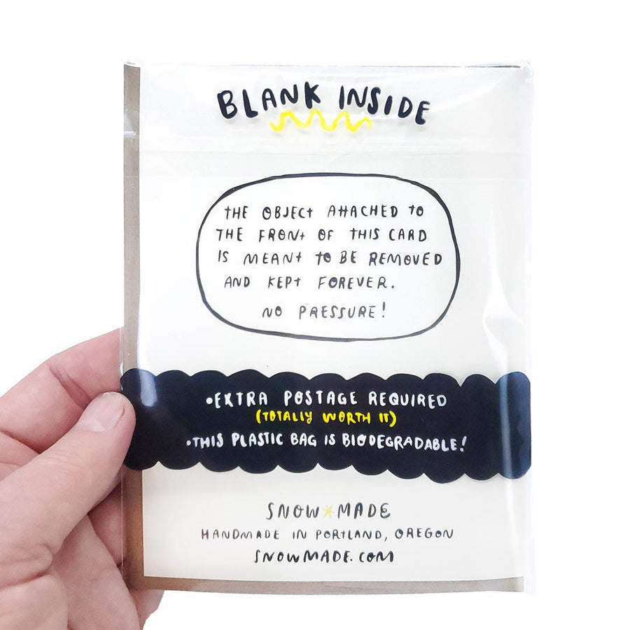 Magnet is made of hand-painted 1/8-inch Baltic birch plywood with a rare-earth magnet. Affixed with a removable glue dot to the front of the card, the magnet easily comes off the card.