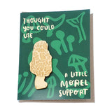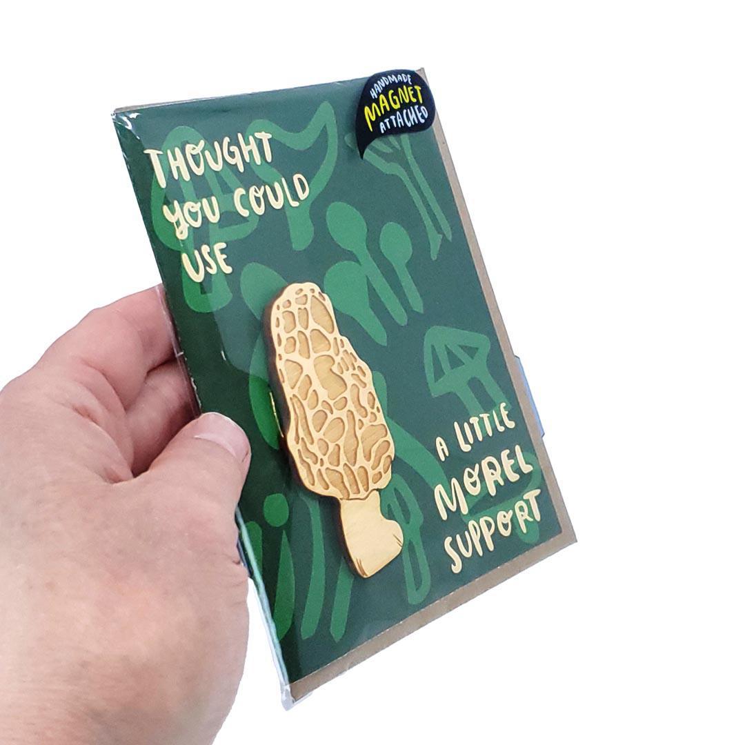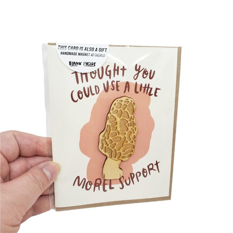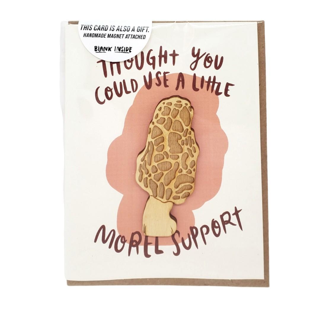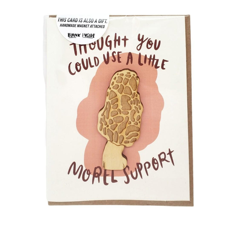 A lovely mushroom is laser-cut out of natural birch wood to lend its support affixed to a card that reads, "Thought You Could Use a Little Morel Support". Dawww! How sweet!
