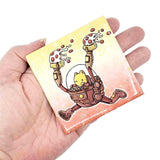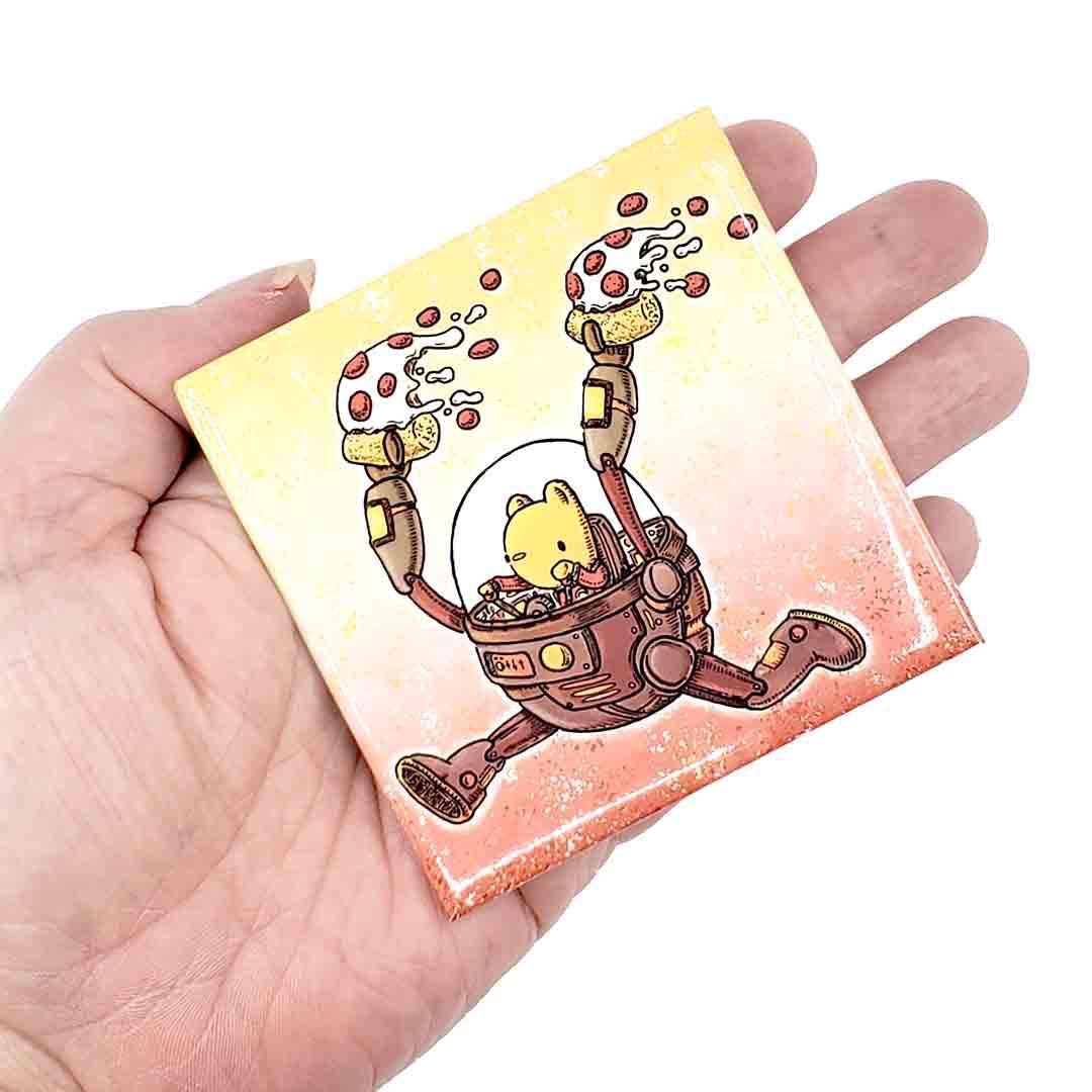 EMERGENCY PIZZA ALERT! This glossy magnet shows a small critter in a robotic suit sprinting away holding two tasty pizza slices.