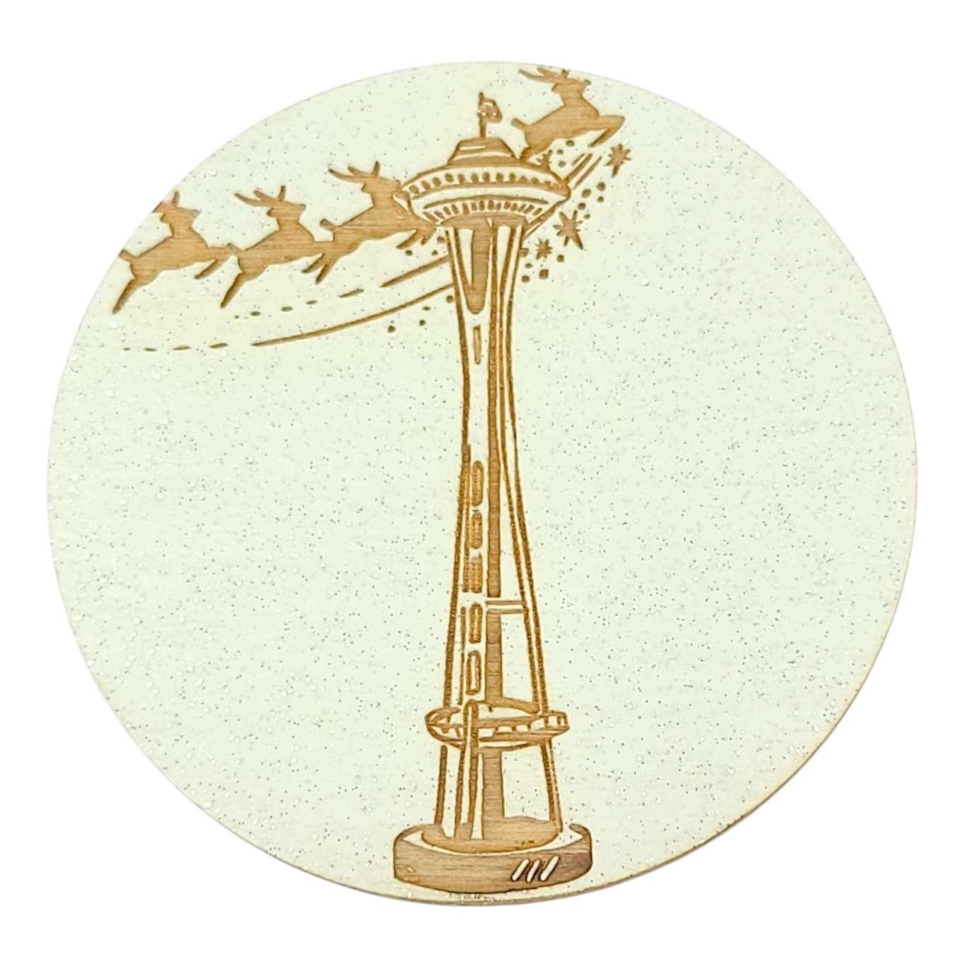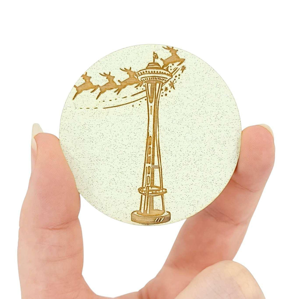 Magical reindeer fly next to the iconic Space Needle on a round magnet painted in a soft seafoam green and covered with permanently affixed glitter to make the scene sparkle!