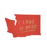 Laser-cut wood in the shape of Washington State with a the words "I Love it Here" engraved across the front. A strong rare earth magnet securely attached to the back.