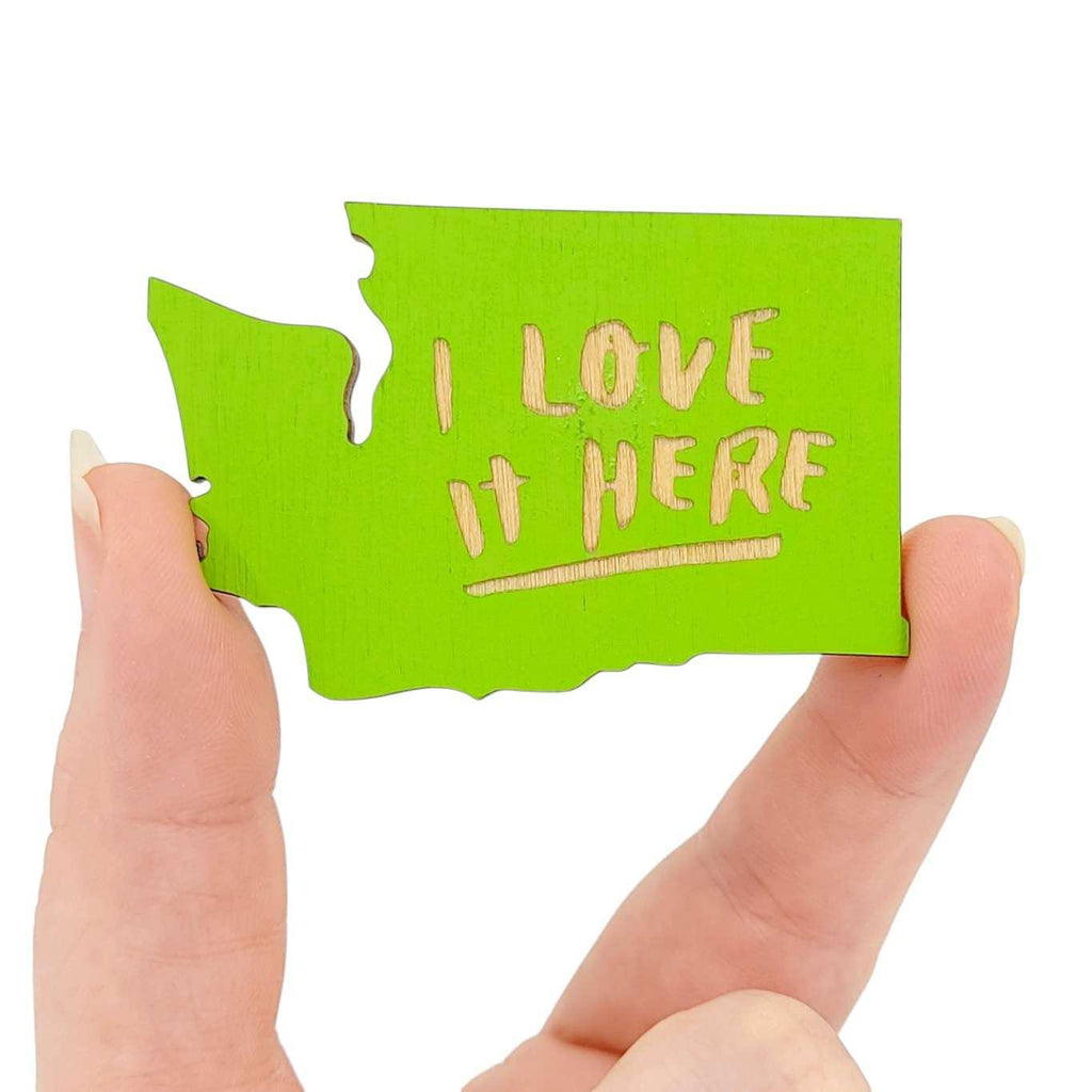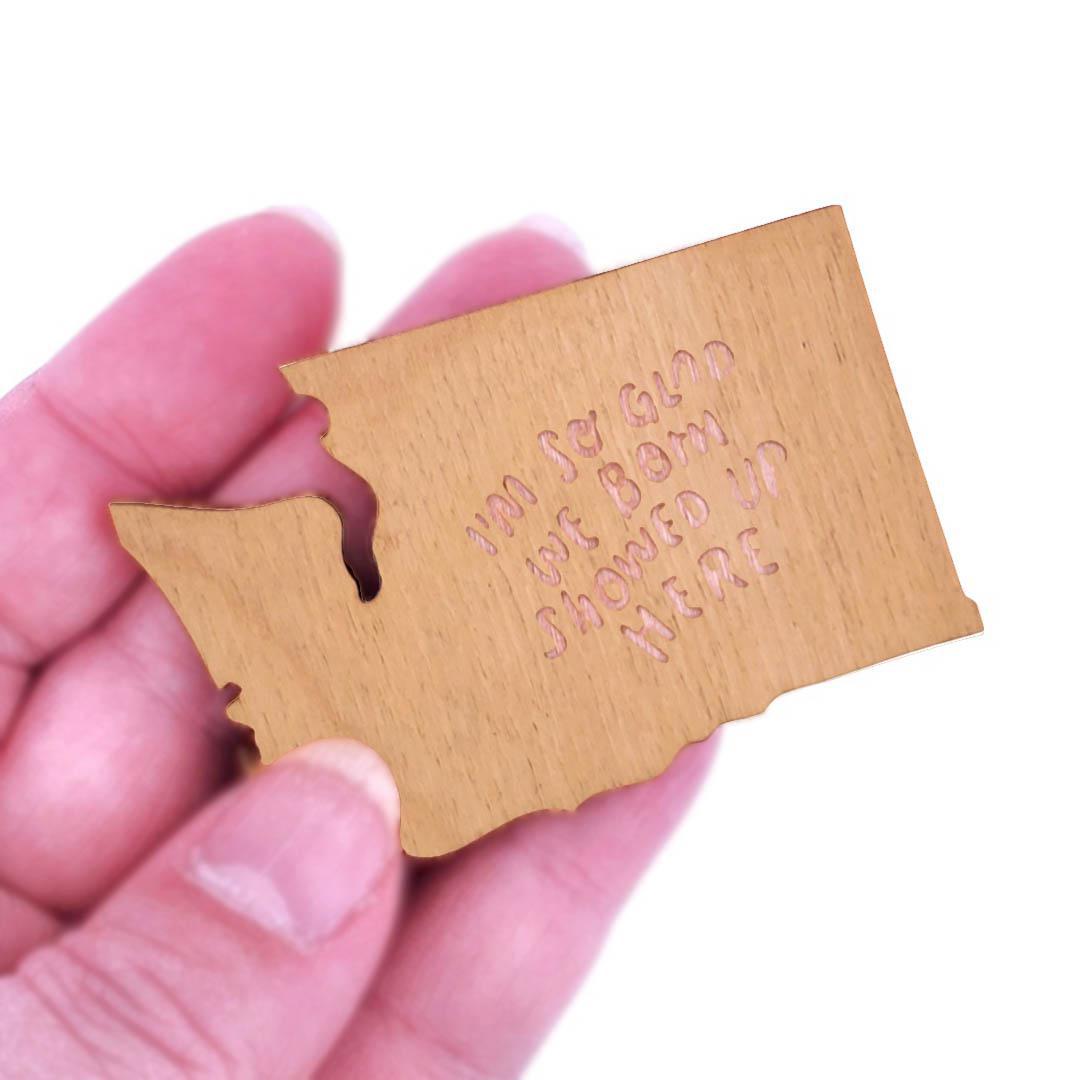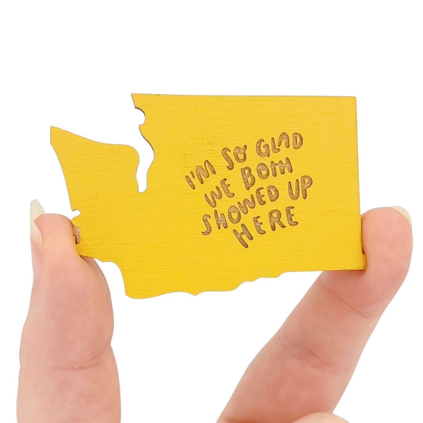 Laser-cut wood in the shape of Washington State with a the words "I'm so glad we both showed up here" engraved across the front. Hand-painted in a variety of colors with strong rare earth magnet securely attached to the back.