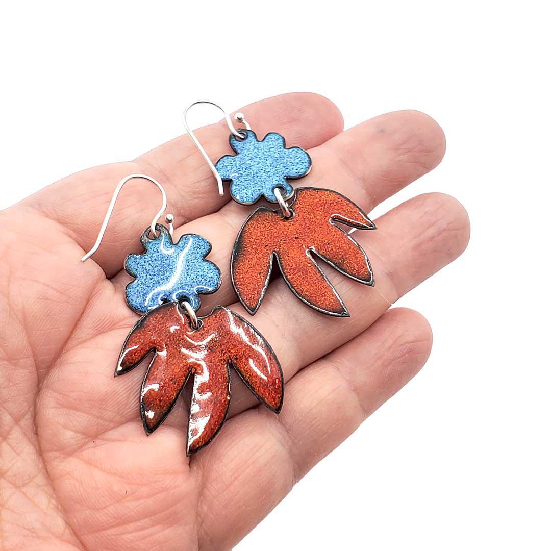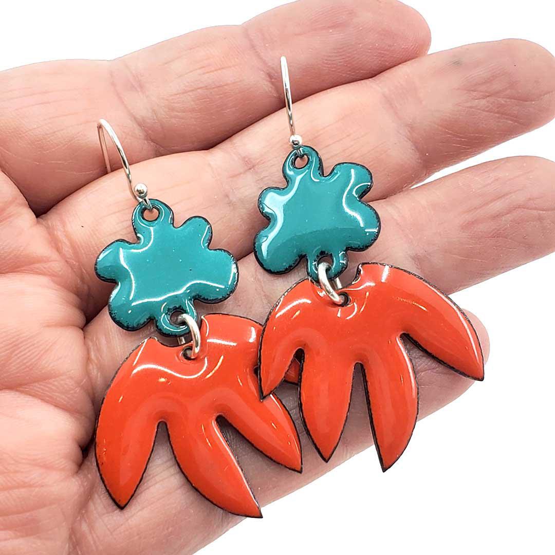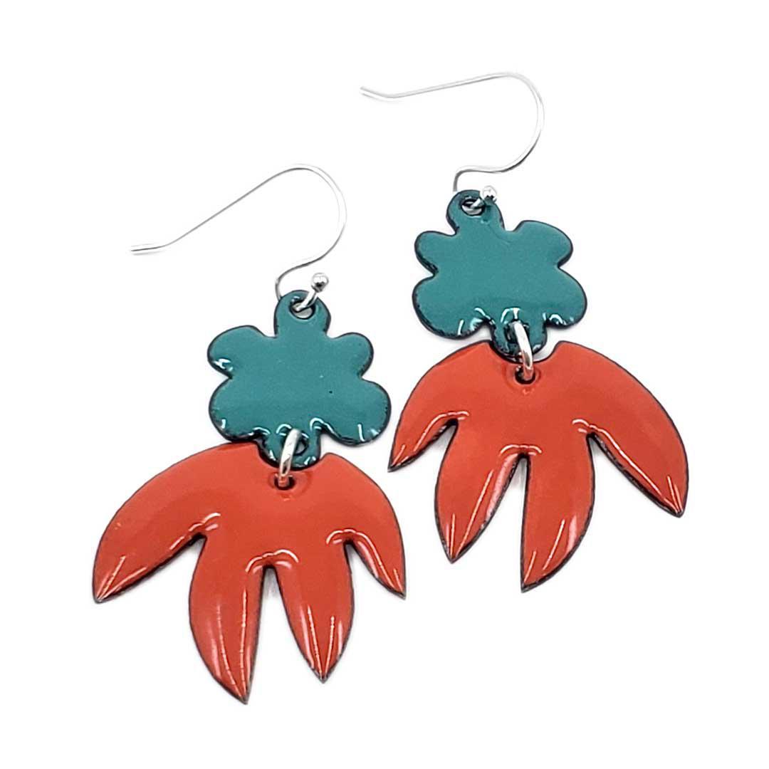 Earrings - Flower Pointy Leaf Dangle (Teal Orange) by Magpie Mouse Studios