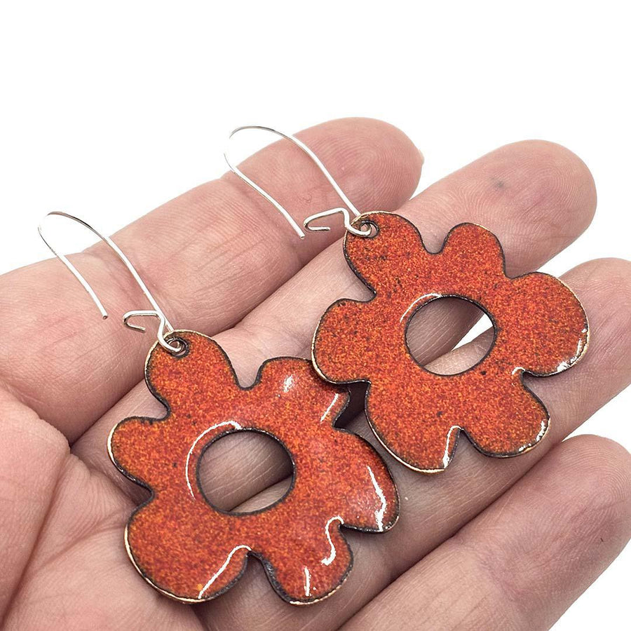 Solid dark red, bright, and modern freeform flower shapes on locking kidney sterling silver ear wires.