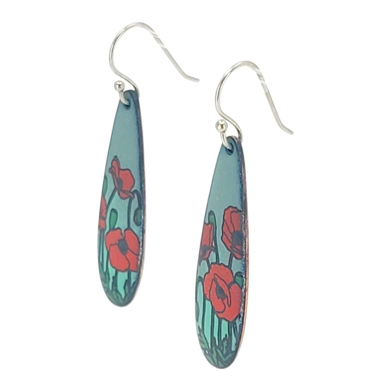 Long teardrop earrings with a copper core decorated with poppies against a gray to turquoise gradient background.
