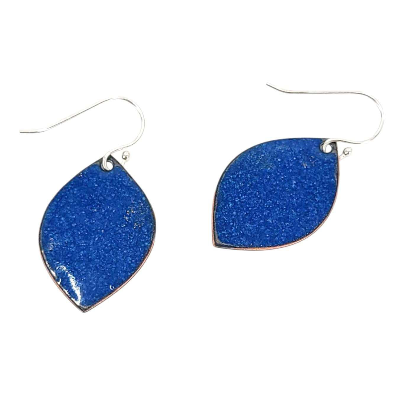 Hand-formed copper wide marquise shapes covered in navy blue glass enamel decorated with red and yellow abstract petals. Even the backs are finished in a gorgeous speckled blue!