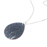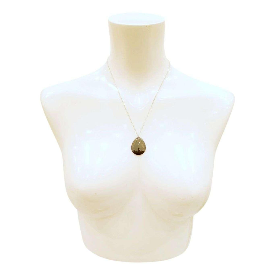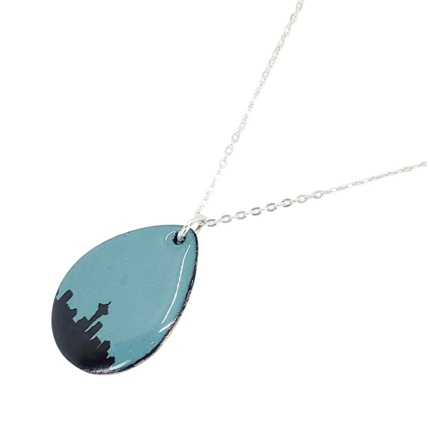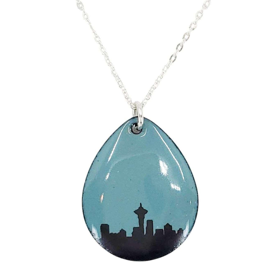 This eye-catching necklace features a teardrop-shaped pendant with a copper core decorated in a design of the Seattle skyline silhouetted over a solid gray background.