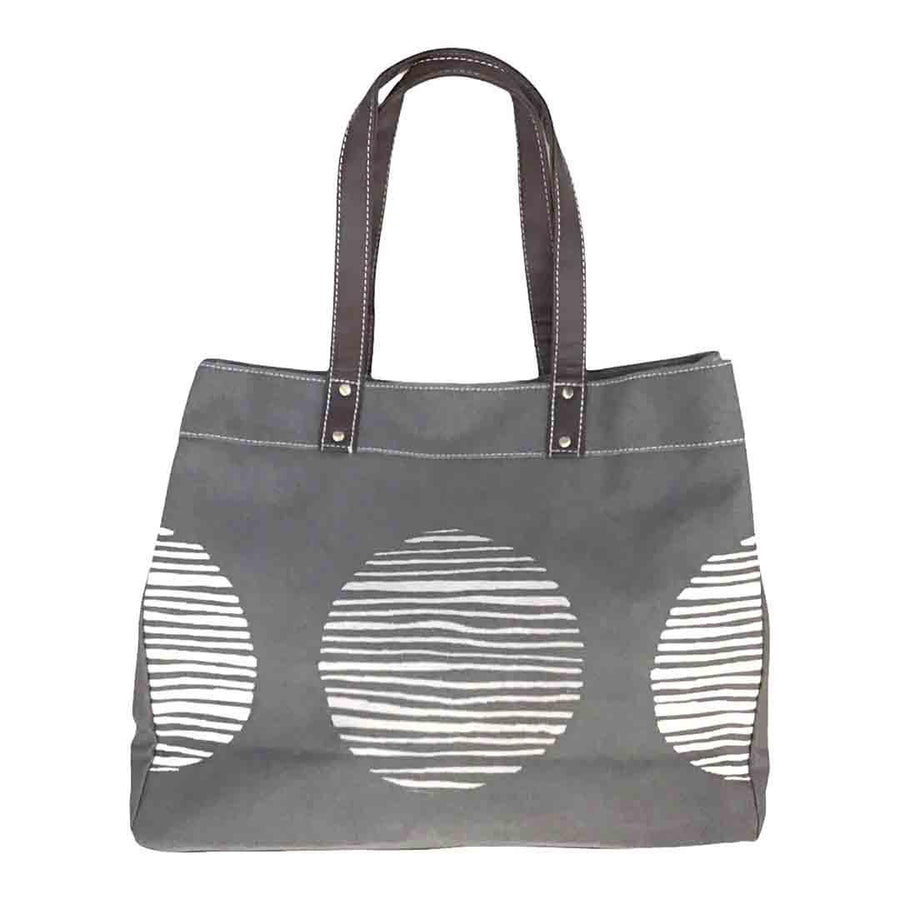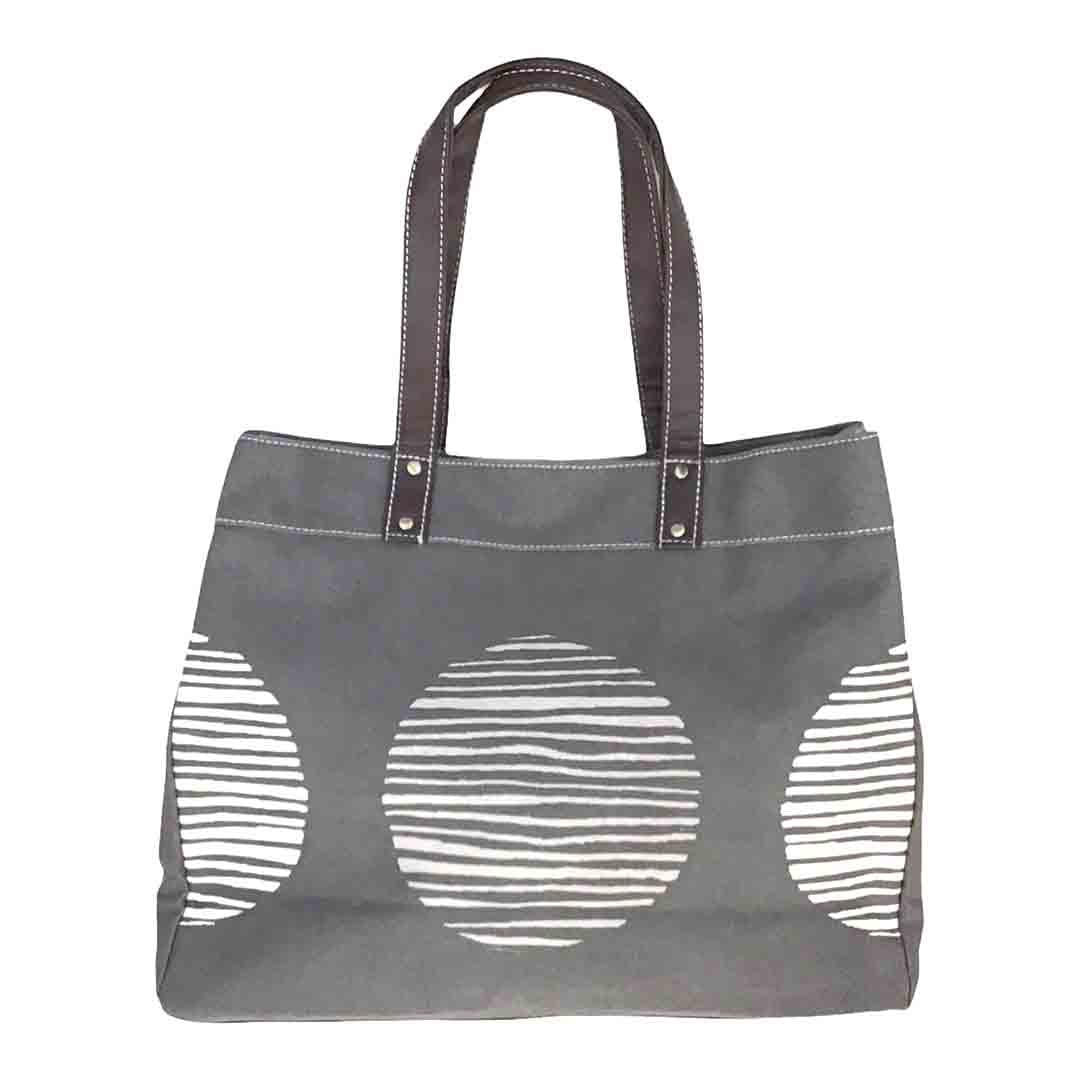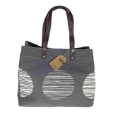 With striped white dot decorations on a dark gray background pattern, this carryall tote is great for the beach, the gym, a run to the market or even a weekend getaway.