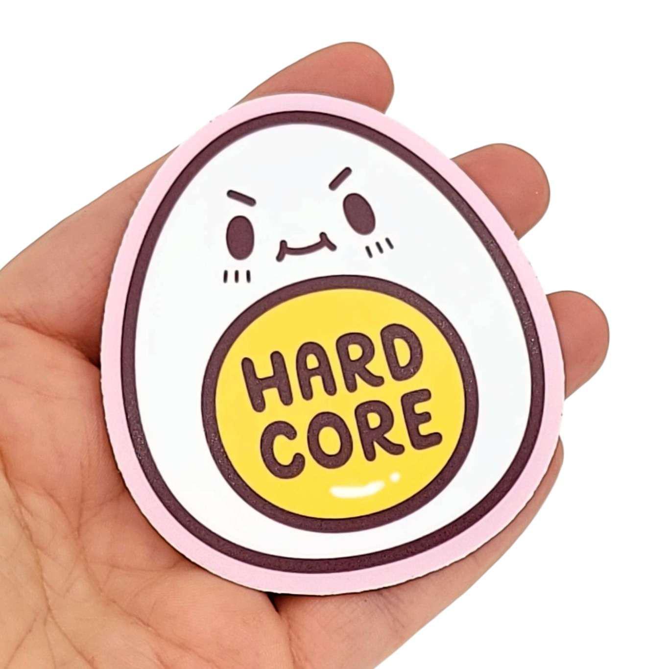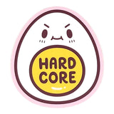 This vinyl sticker features the original artwork by Mis0 Happy--A hard boiled egg with a determined look whose yolk reads "HARD CORE".