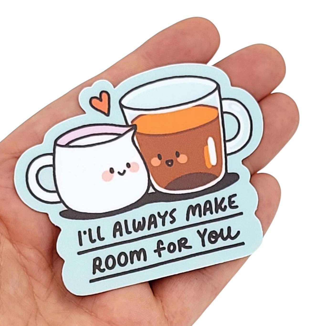 This vinyl sticker features the original artwork by Mis0 Happy--A partly filled coffee cup cozies up to a small pitcher of cream on a latte-colored background with the words, "I'll always make ROOM for YOU" printed below.