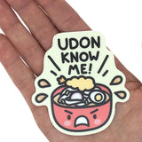 This vinyl sticker features the original artwork by Mis0 Happy--A bowl of egg tempura noodle soup with an upset expression exclaims "Udon Know Me!"