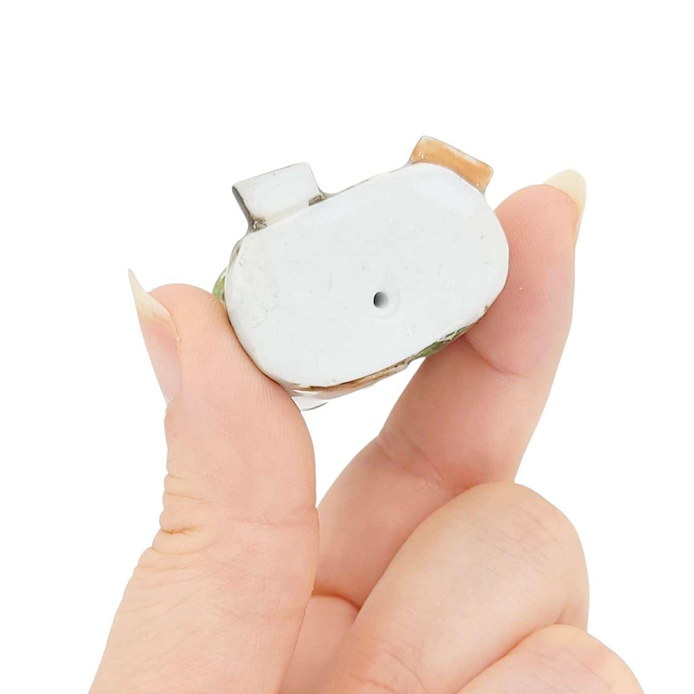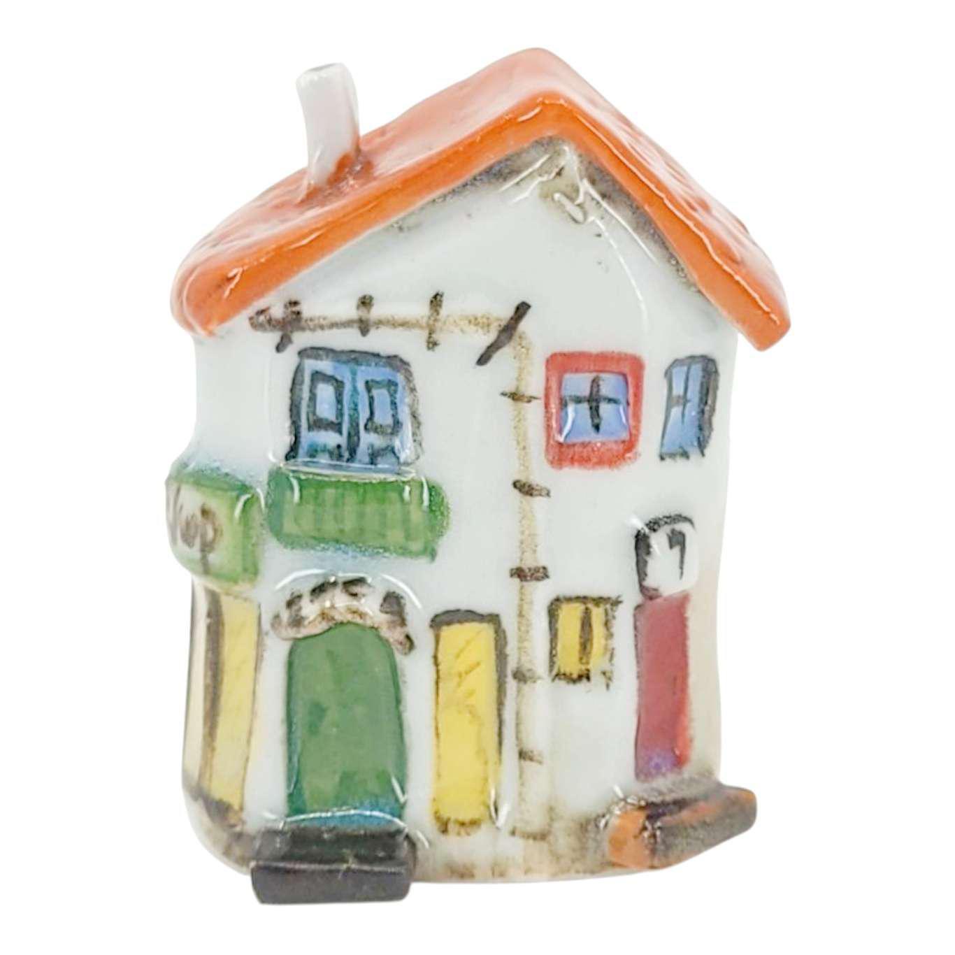 This adorable little ceramic house is beautifully detailed and one-of-a-kind with its white walls, green door, and orange shingled roof.