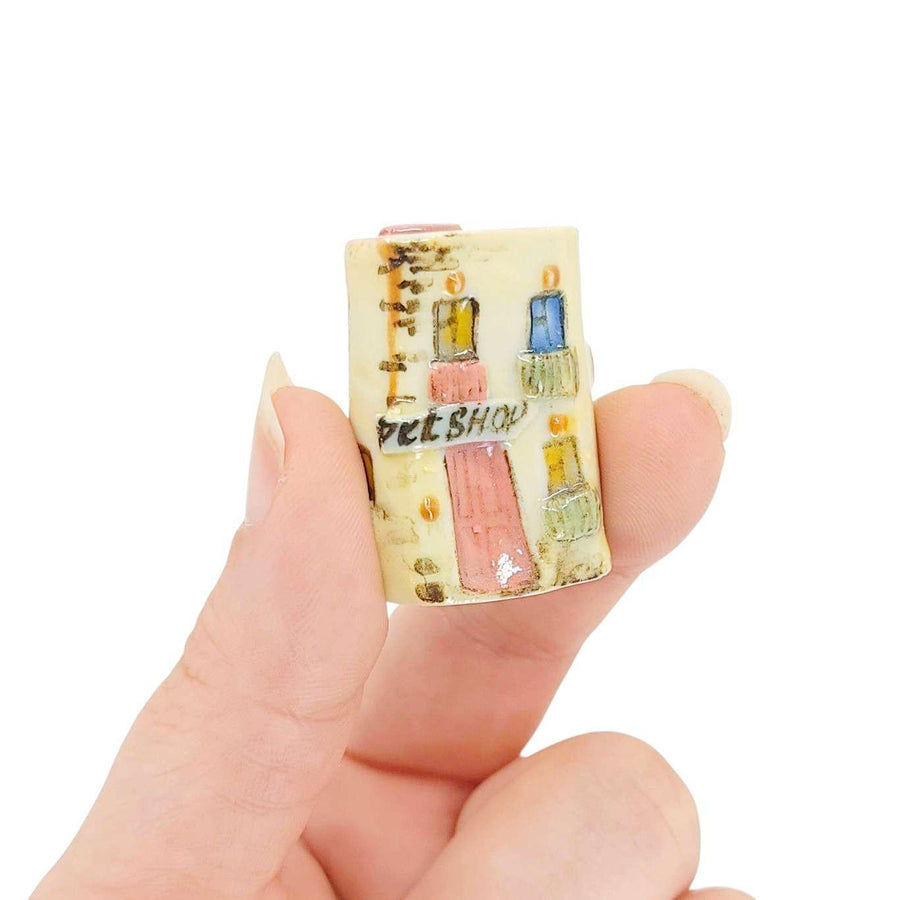 It also features a tiny hand-lettered sign that reads "Pet Shop” as well as architectural features like windows and external piping.