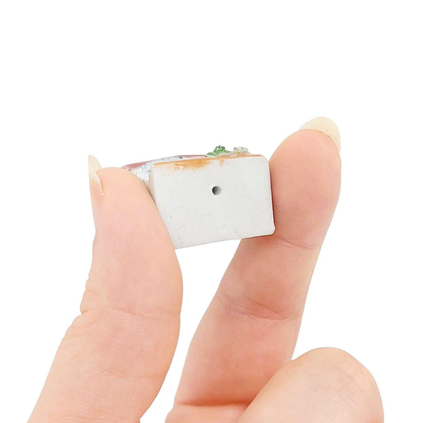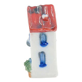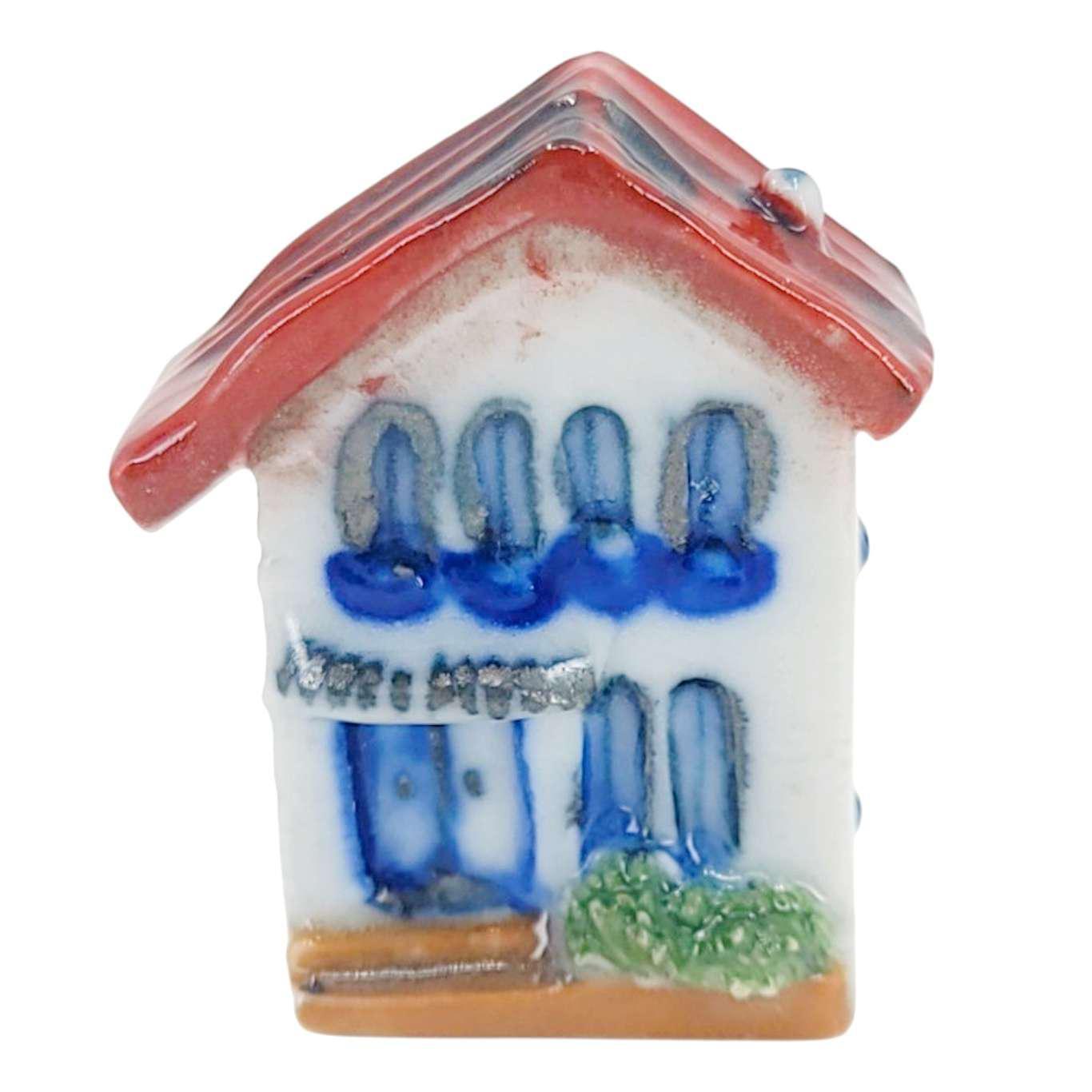 This adorable little ceramic house is beautifully detailed and one-of-a-kind with its white walls, blue-lined white door, and red roof.