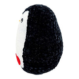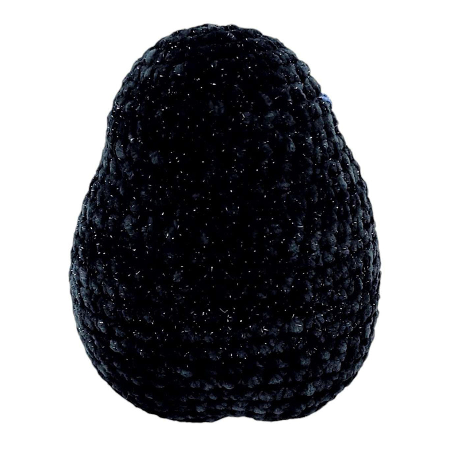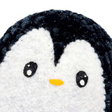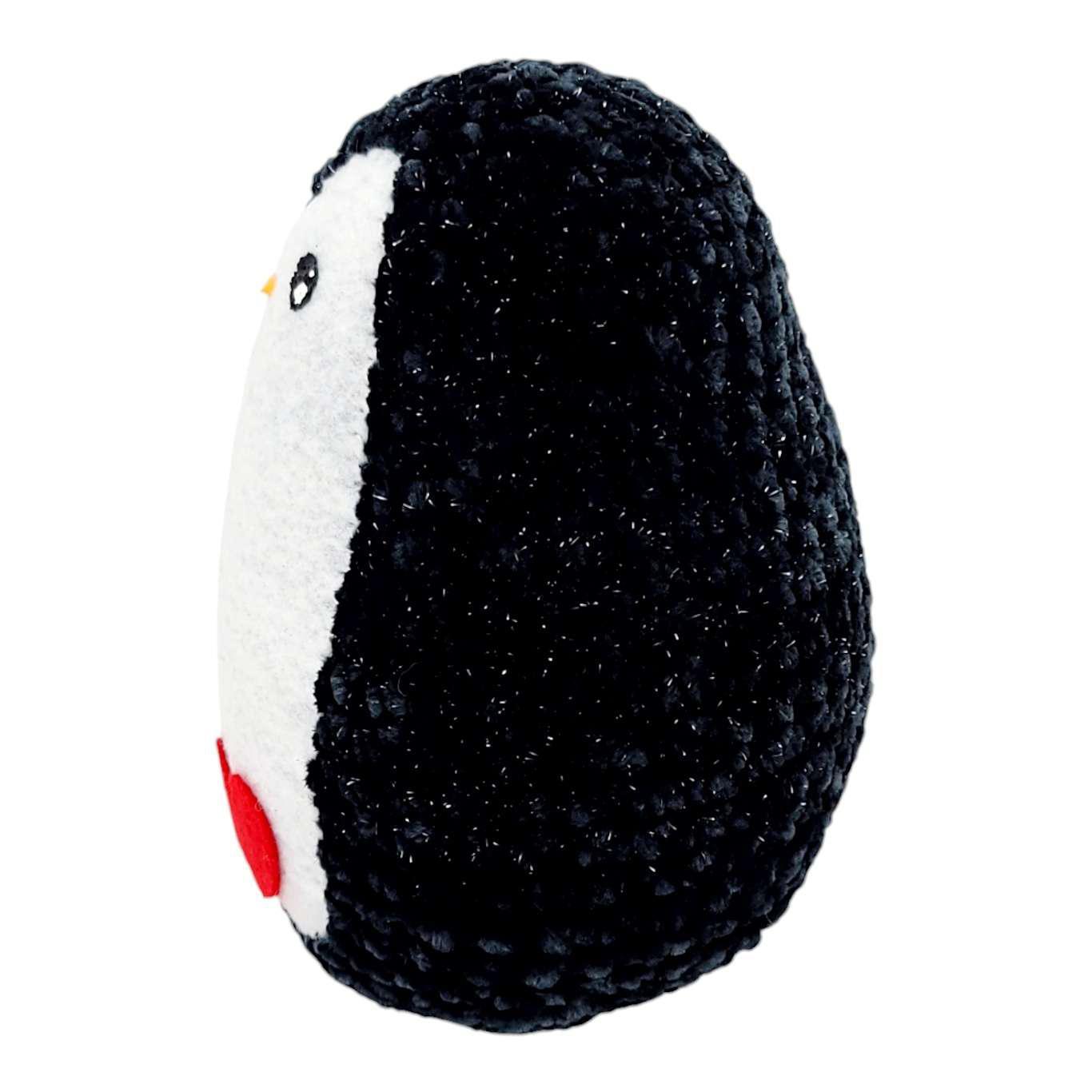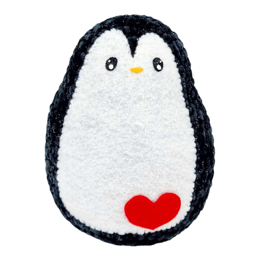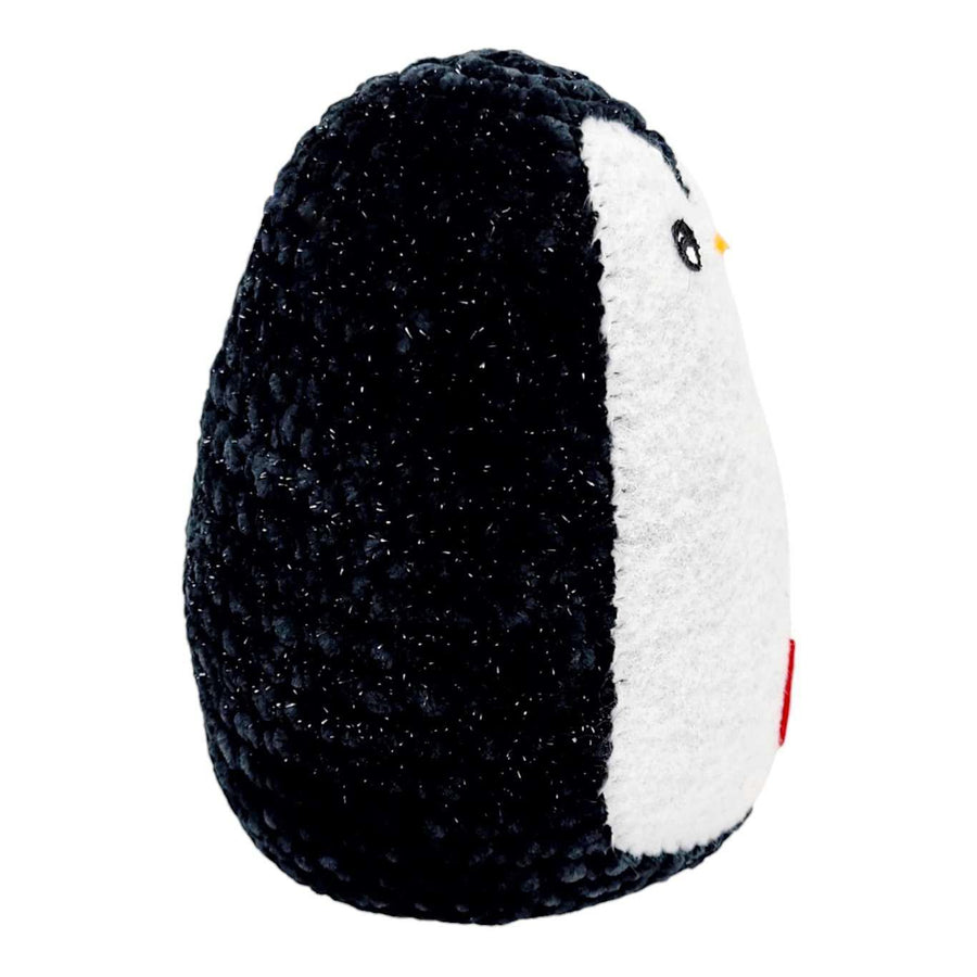 This chunky crocheted penguin is the cutest plush friend with its soft sparkly black body, white felt belly with hand-painted face, and bright red heart.