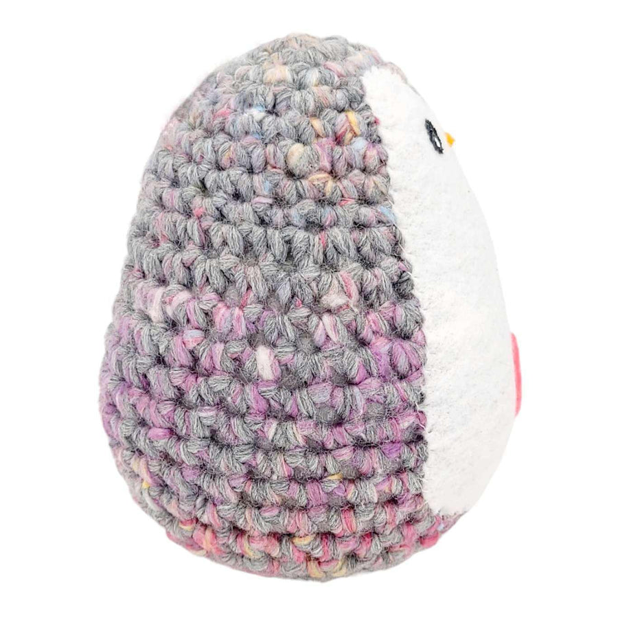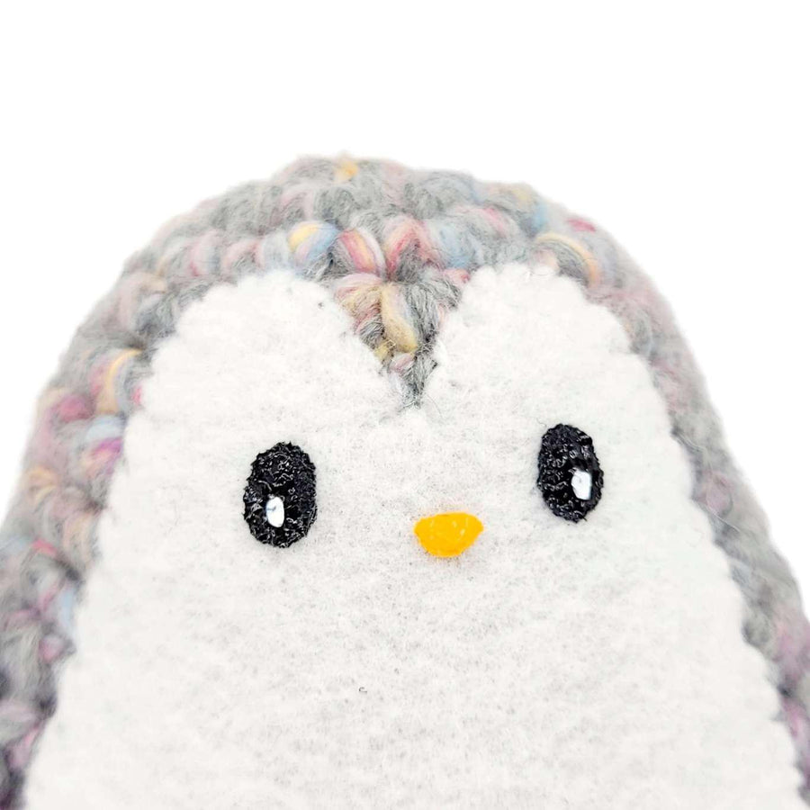 This chunky crocheted penguin is the cutest plush friend with its soft pink and gray variegated body, white felt belly with hand-painted face, and bright pink heart.