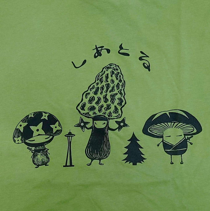 Adult Tee - Mushroom Ninja Trio on Kelly Green Crew Neck Tee (S-2X) by Namu