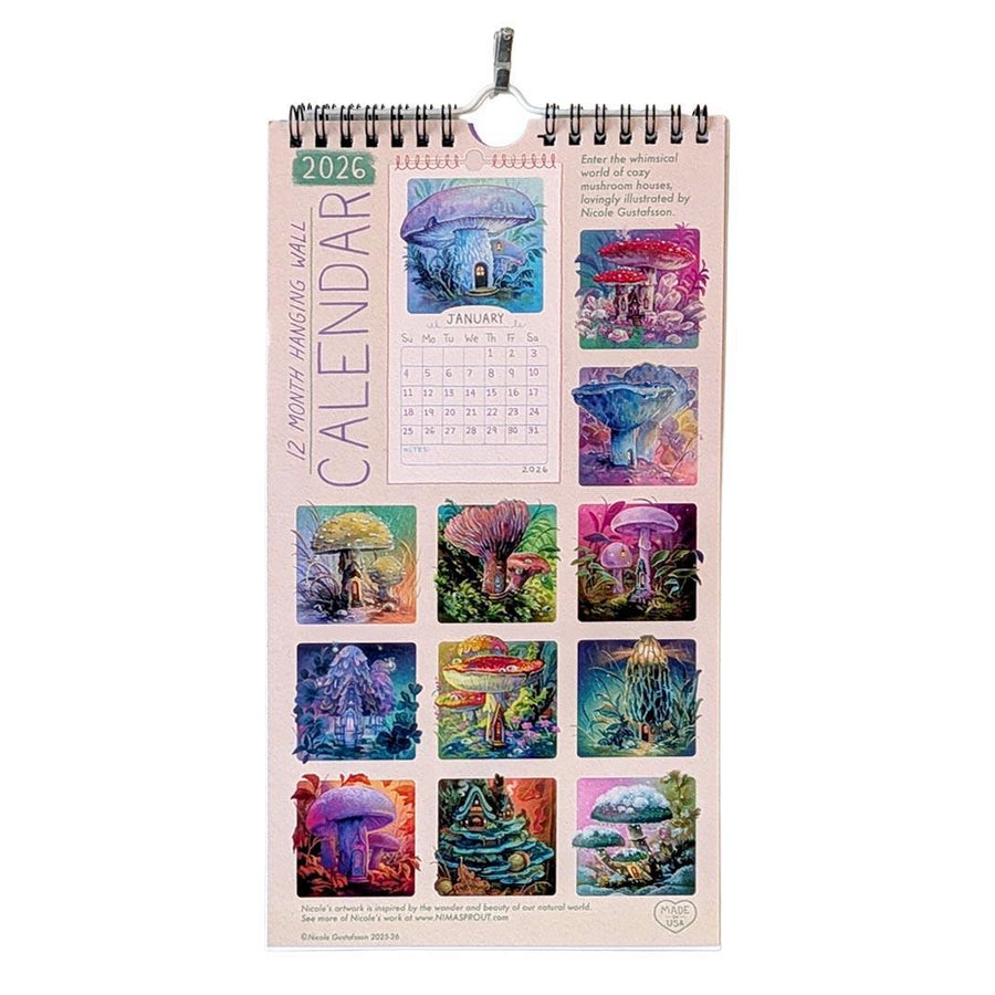 Hanging wall calendar featuring 12 months of cozy mushroom homes painted by Nicole Gustafsson aka Nimasprout! Keep track of your year with a touch of whimsy and playfulness. Large enough to make notes for your appointments but not TOO big to find a place to hang.
