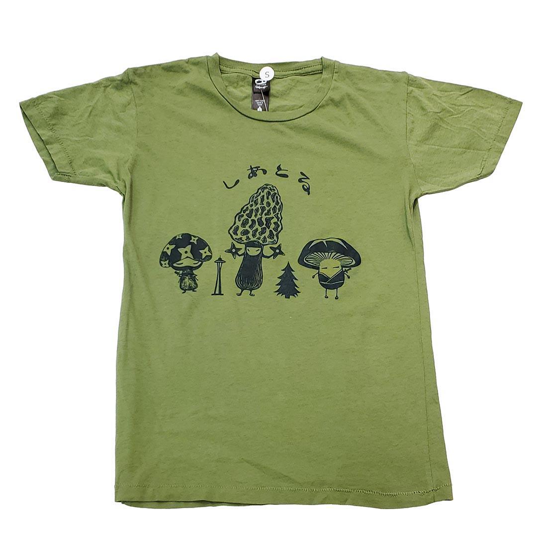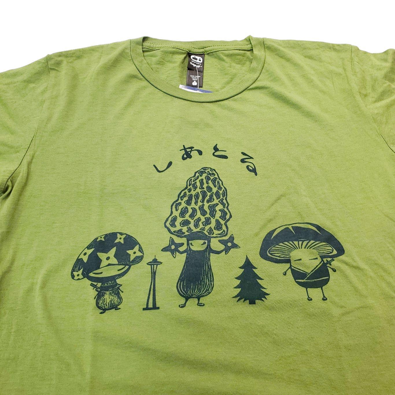 These three ninja mushrooms are ready for action. Screen-printed in black ink on a heather green tee with a fun way to say Seattle printed in Japanese above.