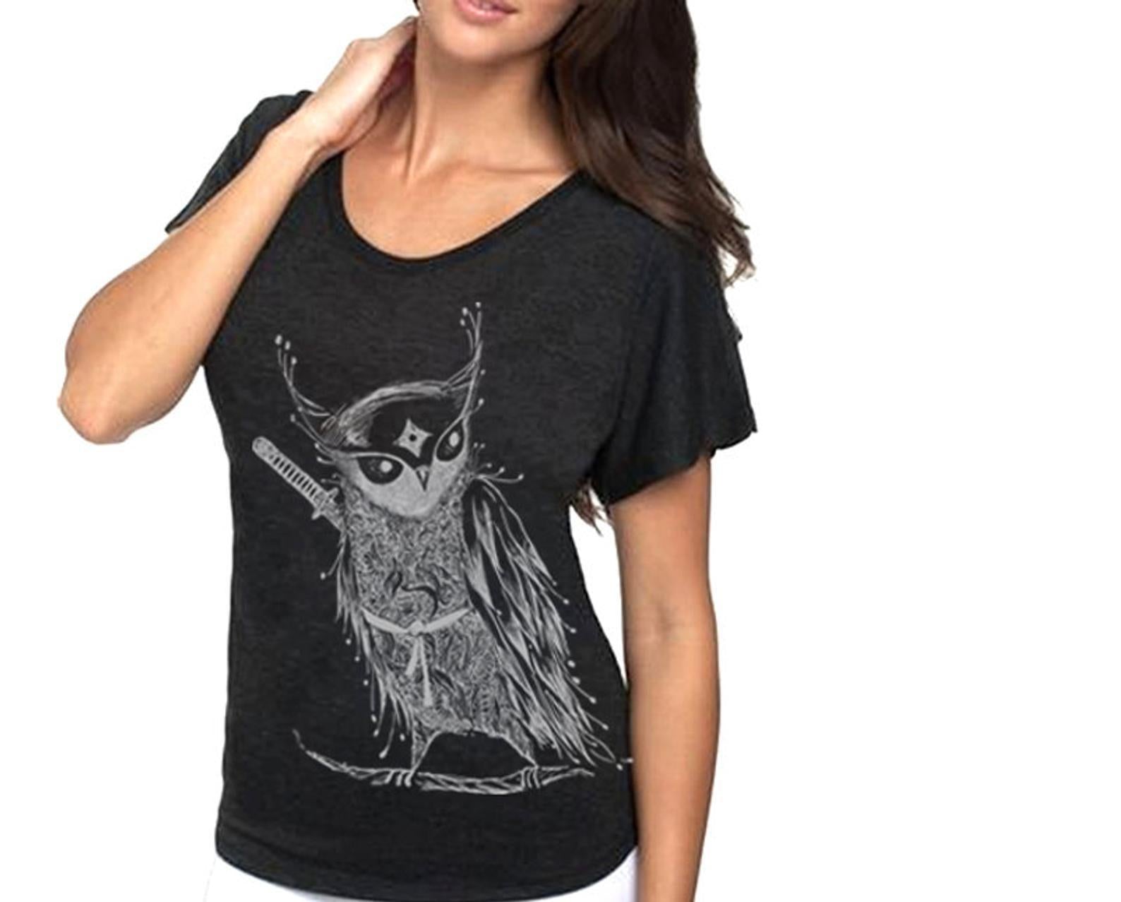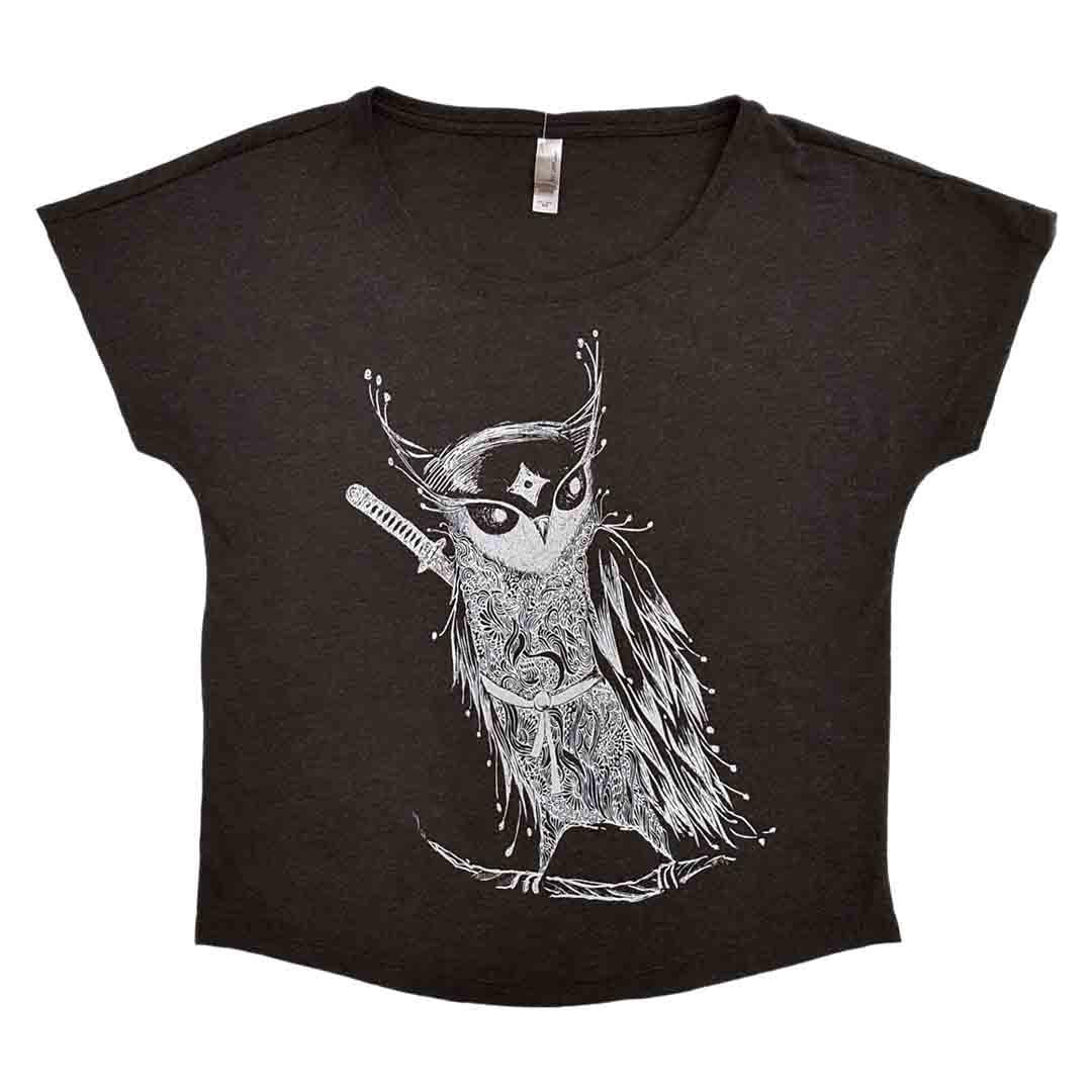 A wise Samurai Owl stands watch on this flattering scoop neck short sleeved tee.