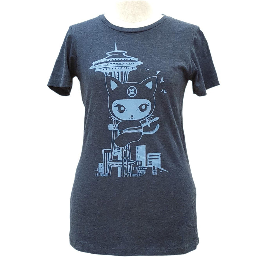 A stealthy ninja kitty climbs the space needle on this cool, comfortable shirt! Screen-printed in light blue ink on a heather dark blue background. Shirt is made of a soft 60% combed ringspun cotton/40% polyester jersey fabric and has a contoured shape with a crew neck and short sleeves.