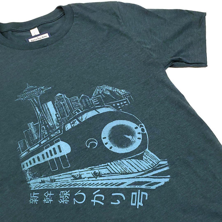 Adult Tee - Seattle Skyline Hikari Shinkansen on Dark Teal Crewneck Tee by Namu