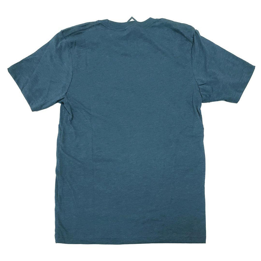 - Screen-printed in aqua ink on a heathered dark teal blue tee