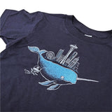 Comfy heathered navy blue 100% cotton crewneck t-shirt with a whimsical illustration of the Seattle Skyline and Space Needle above and a fanciful narwhal with diving ninja friend underneath.
