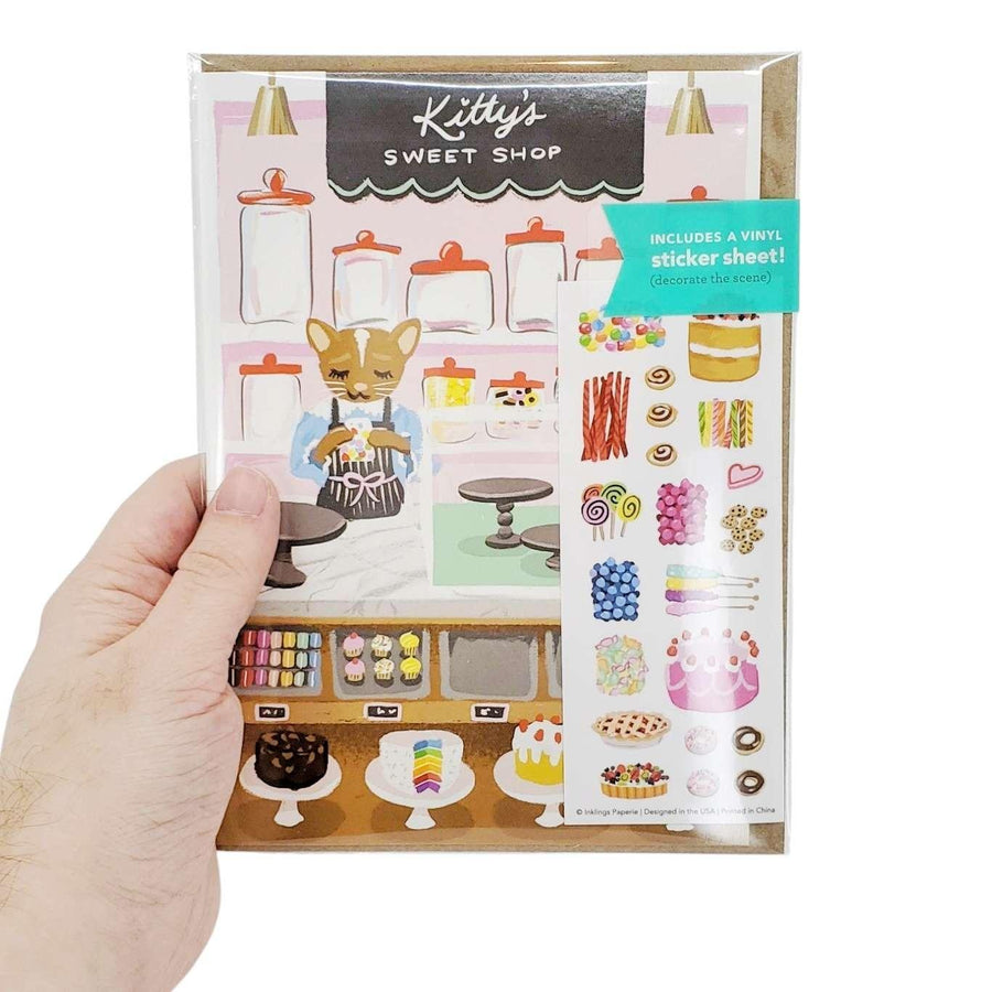 Go ahead, make a scene... on this cute card that features a baker kitty running a sweet shop! Our Sticker Scene Cards come with an adorable sheet of vinyl stickers to decorate the scene and make it your own. This greeting card is coated with a special finish, making the stickers easy to adjust and reposition again and again! This card is fun for all ages.