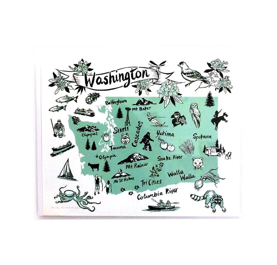 This blue green giclee print features landmarks, icons, recreational activities, flora and fauna from the great state of Washington.