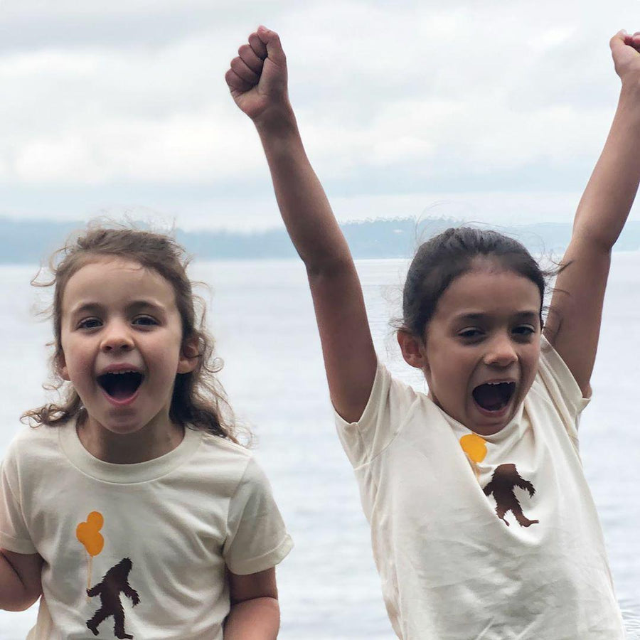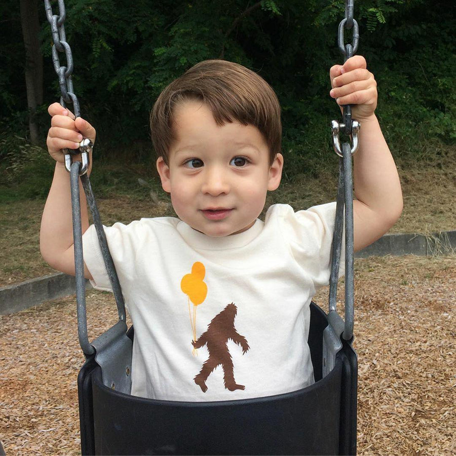 Featuring the unofficial mascot of the Pacific Northwest, this 100% organic cotton shirt is printed by hand in Seattle with water-based ink. Sasquatch makes an appearance with balloons--he's not one to show up empty handed!