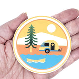 This Camping sticker is 3 inches in diameter and made of high-quality vinyl and finished with a protective laminate. You can put them on water bottles, skateboards, laptops, notebooks, basically whatever you like! These stickers make a great gift too!
