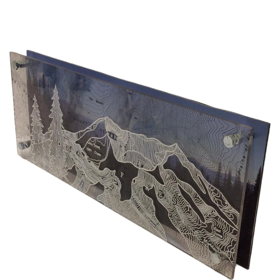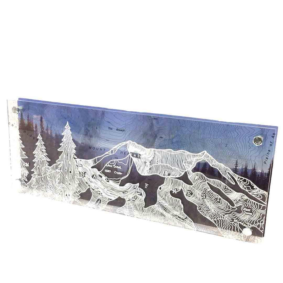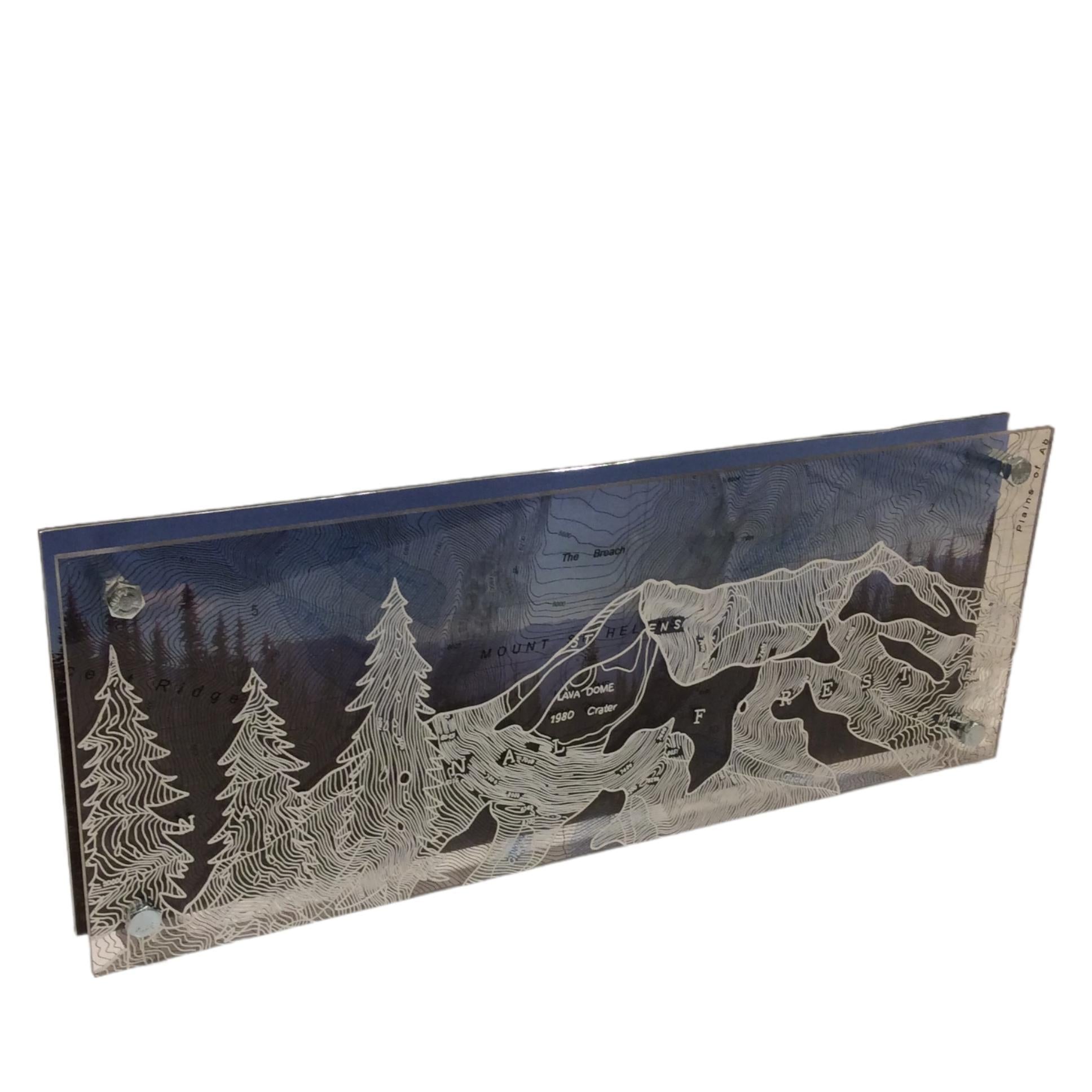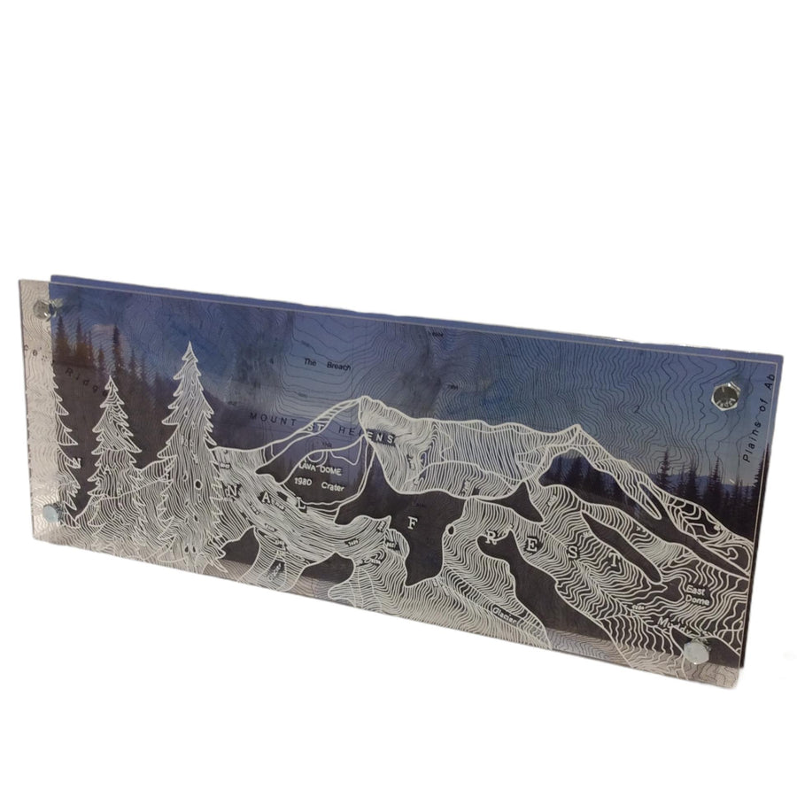 Multi-layered contemporary artwork featuring a design of Mount Saint Helens and several of her trees drawn atop a vintage map of Mount Saint Helens on clear acrylic. The artist draws with white ink following the map lines to create the image. The transparency is then backed by an original photograph printed on aluminum.